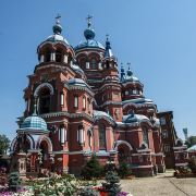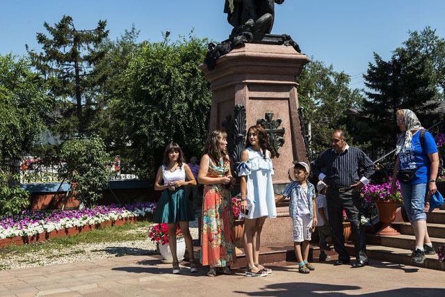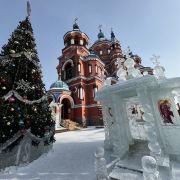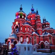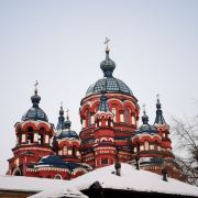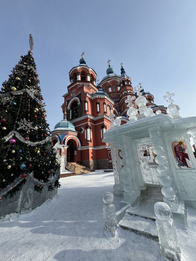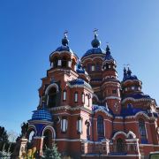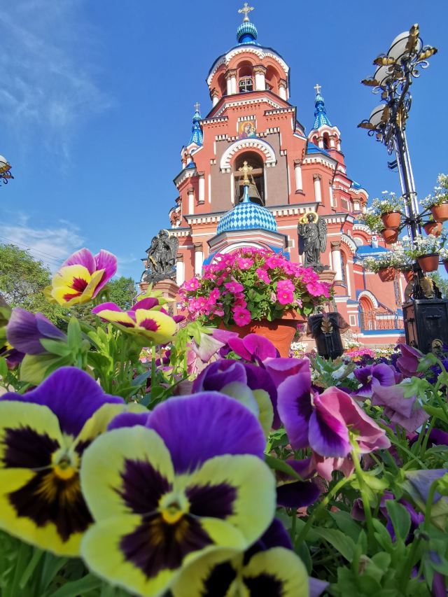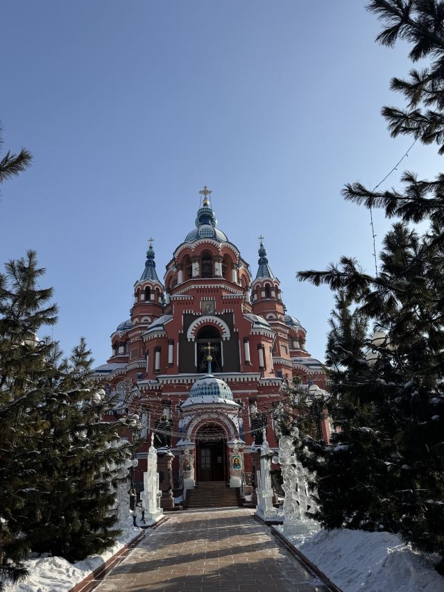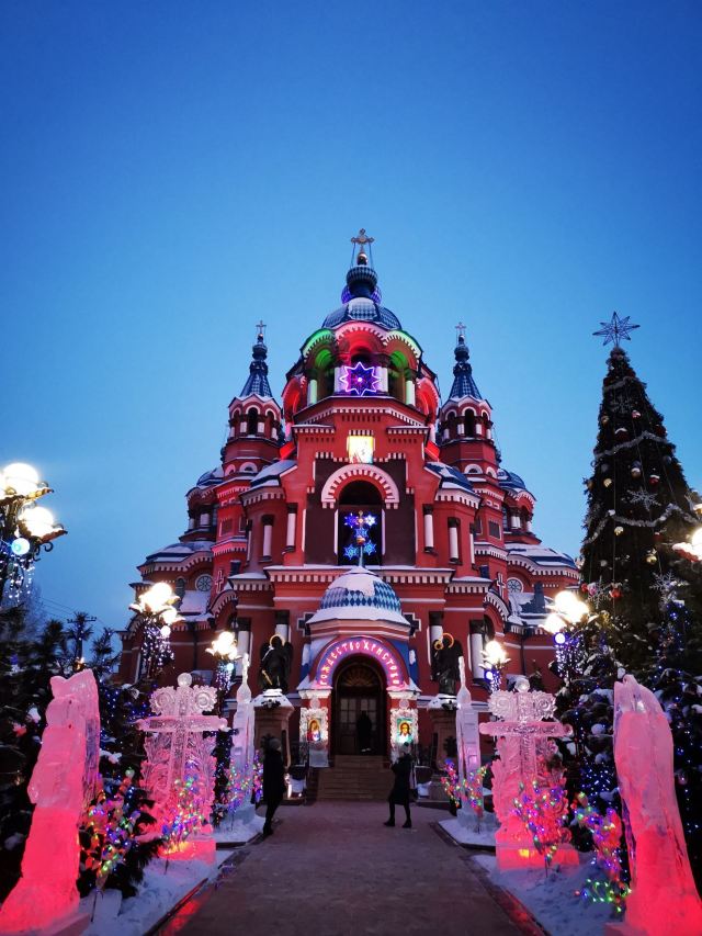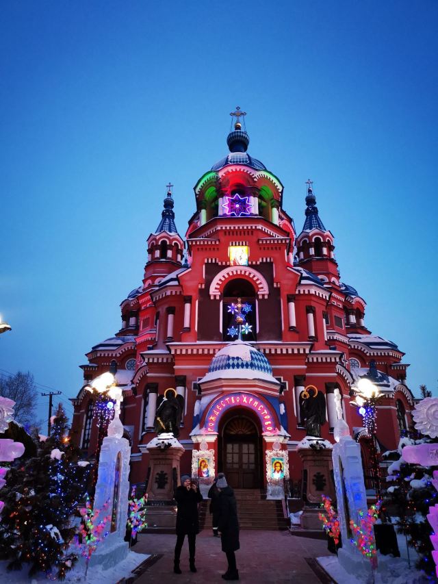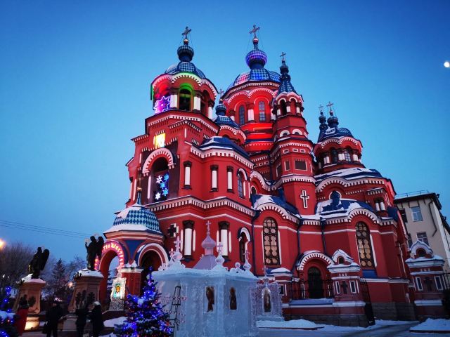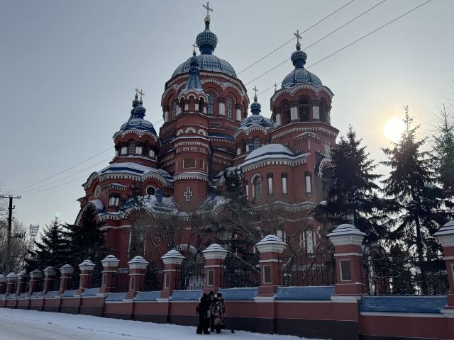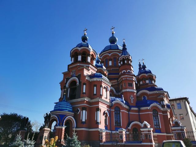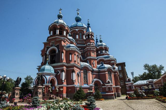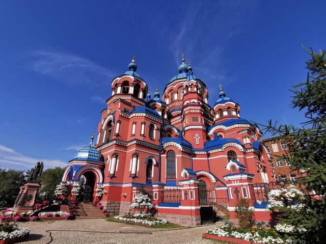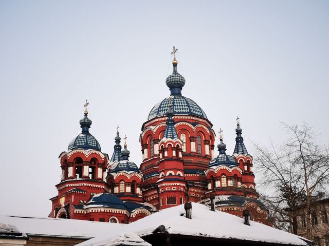 作为一座东正教教堂,喀山圣母教堂具有典型的拜占庭式风格,浑厚的红色外墙,蓝色洋葱头般的穹顶,在西伯利亚灿烂的阳光照耀下熠熠生辉,如同童话中的城堡,极具视觉冲击力。
