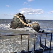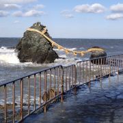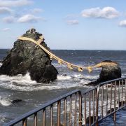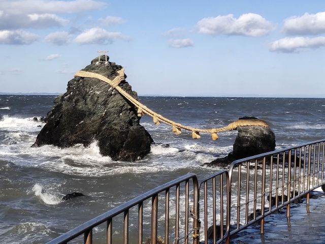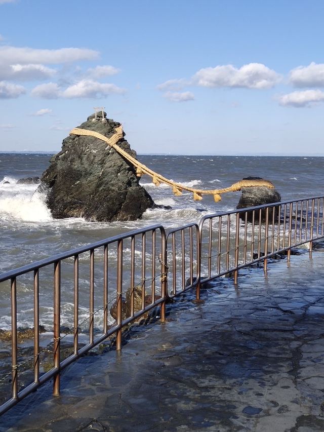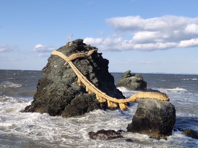 日本各地,有几十个“夫妇岩”,以三重县夫妇岩为有名。由一根粗大的草绳海上一大一小两块礁石连结在一起,是喜结良缘、家内安全的象征。两块礁石离岸边660米,男岩高9米,女岩高4米。2块岩石像夫妇一般相依相随,故叫做‘夫妇岩’。连结它们的稻草绳叫做“注连绳”,每年要更换三次。5月—7月,可以从夫妇岩之间,观看日出。特别是夏至前后时分,天气好的话,能看到远处的富士山为背景,到此拍照旅游参拜游客众多。每年5月5日、9月5日、12月中旬的周六、日,举行“注连绳”更换祭奠仪式。另外,11月—1月期间,还能从夫妇岩之间欣赏到满月。