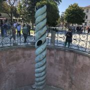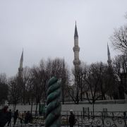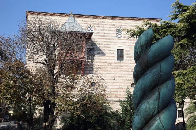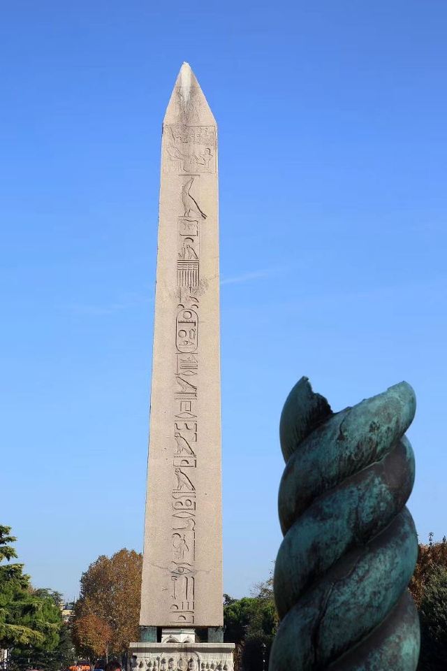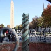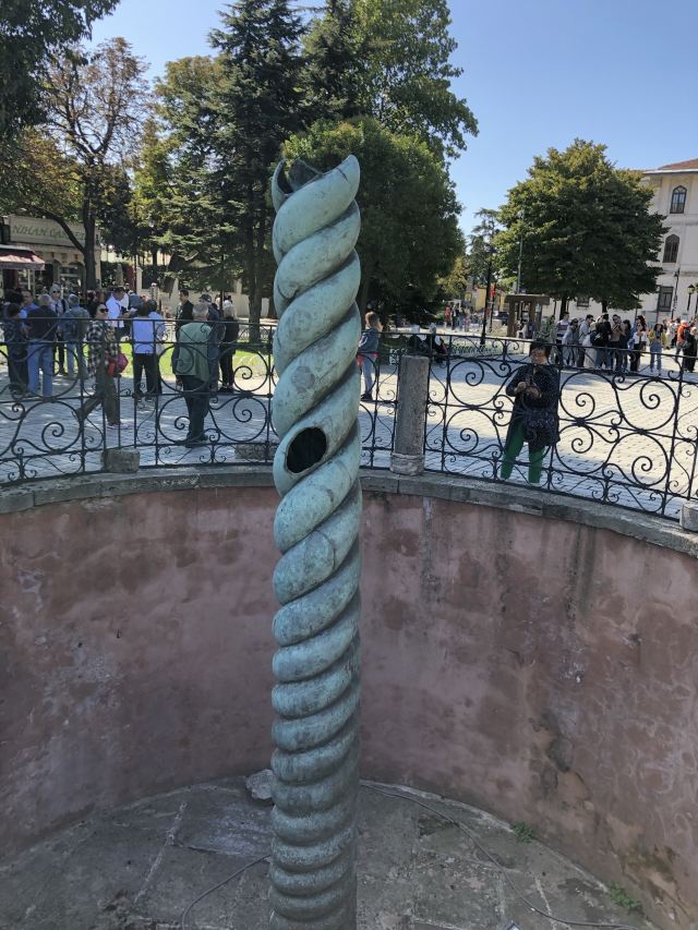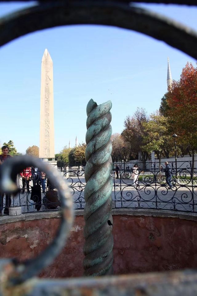 蛇柱又称德尔斐三脚祭坛或普拉提亚三脚祭坛,是一根古代铜柱,位于土耳其伊斯坦布尔的君士坦丁堡赛马场。它是古希腊三脚祭坛的一部分,起初位于德尔斐的阿波罗神庙,在公元324年被君士坦丁大帝移往君士坦丁堡。在8米高的柱顶曾有3个蛇头,一直存在到17世纪末,其中一个蛇头的部分现在在附近的伊斯坦布尔考古博物馆展出。蛇柱因其精美的雕刻和悠久的历史吸引着众多游客和历史爱好者。游客可以在广场漫步,欣赏这座古老的纪念碑,并感受其背后的历史故事。