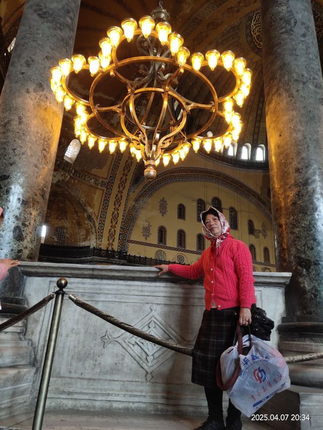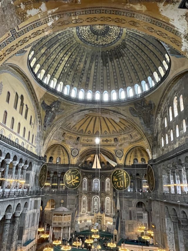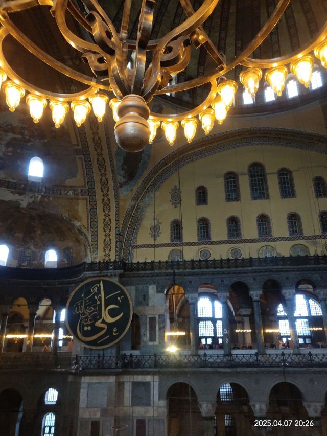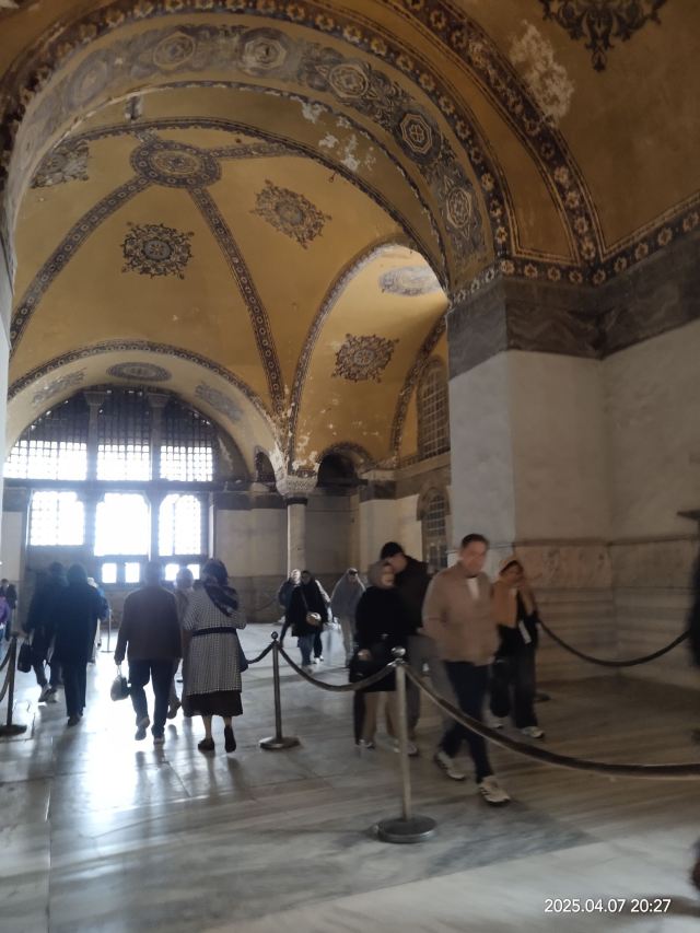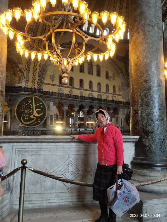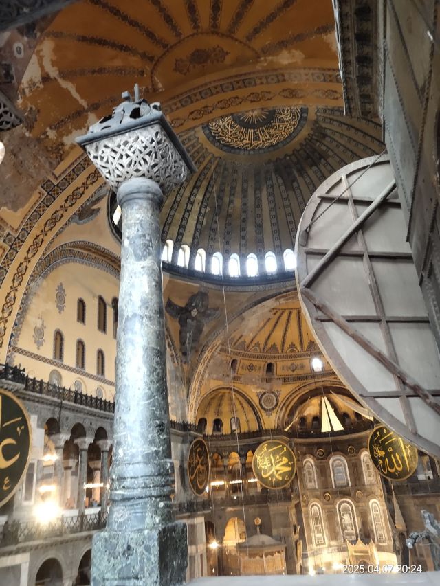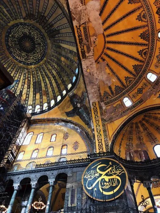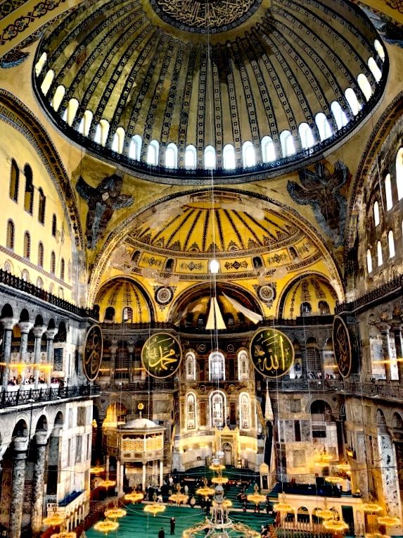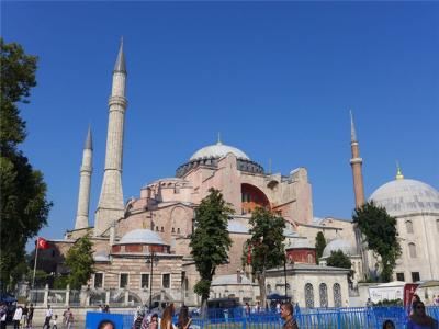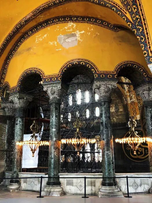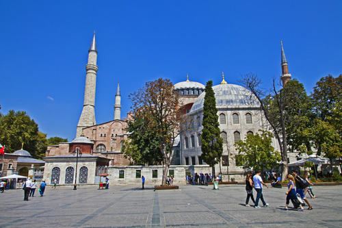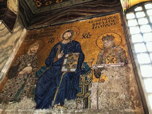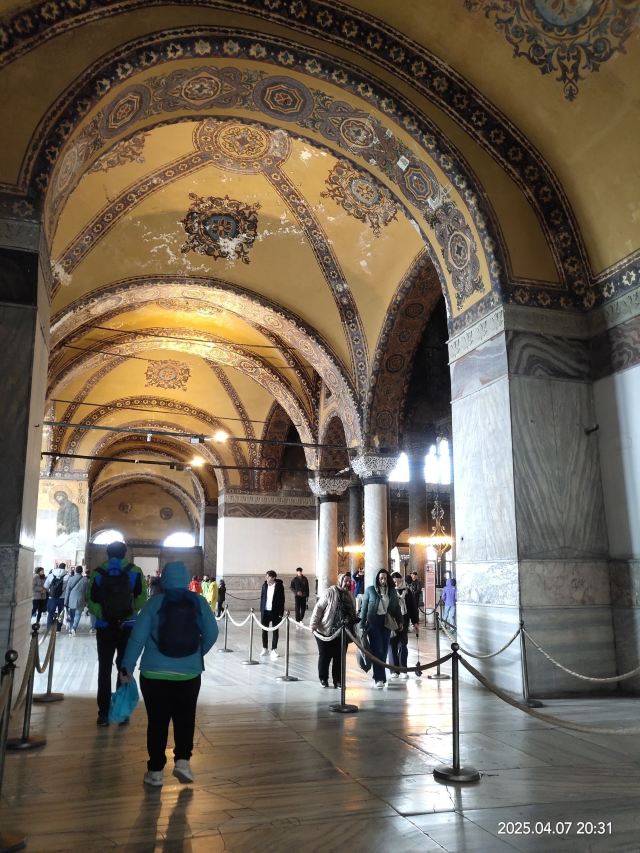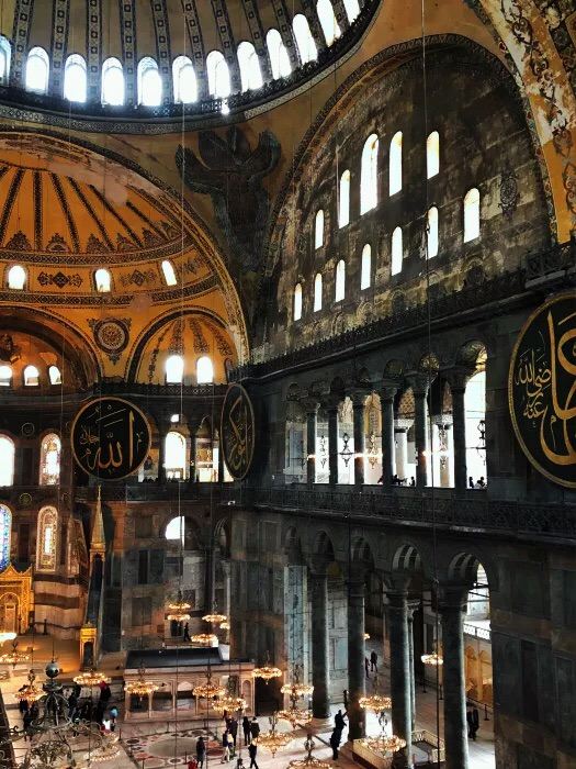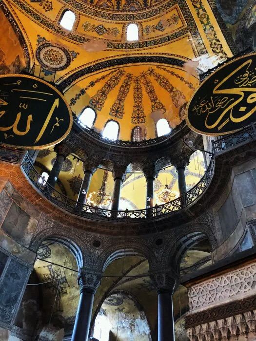 微信小程序阿亚索菲亚大清真寺与蓝色清真寺隔街相望,早期是拜占庭帝国的主教堂,后被土耳其人占领后改建成为清真寺。这是一座土耳其的历史建筑,也是土耳其的象征之一。阿亚索菲亚大清真寺外部是典型的清真寺圆顶和尖塔,在教堂前有一个净洗亭(清真寺用),旁边立着几根顶部雕刻花纹的石柱。通往中央大厅的9道门教堂的前厅中共有9个门通往教堂的中央大厅,其中中间的大门称为“帝王之门”,曾经只有皇帝和皇后才能从这里进入,其左右两侧各有4个门,左右两侧的大门是给普通百姓走的,中间2个大门是给贵族大臣走的。气势恢宏的中央大厅中央大厅内部的地板由多色大理石铺成,墙面上也是彩色大理石镶嵌的图案,显得色彩斑斓。阿亚索菲亚大清真寺里大大小小的隔窗和低垂的吊灯维持着大殿中的光线,而精美的吊灯为大厅带来了温馨的气氛,加上高大的穹顶,让人有种敬畏的感觉。穹顶保留着拜占庭式的壁画,色彩十分丰富。欣赏圣坛和大圆盘教堂的圣坛顶上有着一副圣母子像,俯视着下方。在圣坛左右两侧均有直径约10米的大圆盘,挂着六块黑底阿拉伯金字的大圆盘,大圆盘上写着是人名。这样的圆盘在大厅内共有6个。而圣坛的右侧是加冕处,左侧是讲经的阳台。参观二楼回廊从大厅旁长廊尽头的螺旋通道可以到达二楼,那里是达官贵人和女士们做礼拜的地方。回廊墙壁上有很多描绘基督教故事的壁画。由此俯瞰整个大厅,更能感受到大殿气势宏伟的空间设计。柱头、柱基和柱身的交接线处,都是以金色和蓝色作底色的艳丽纹饰装点着。而柱头精细的雕琢,令人叹服。走在二楼的回廊上,右侧为“皇后包厢”,其下方就是一楼进门处的“帝王大门”。站在二楼可以清楚的看见大门上方镶嵌有精美的马赛克画。