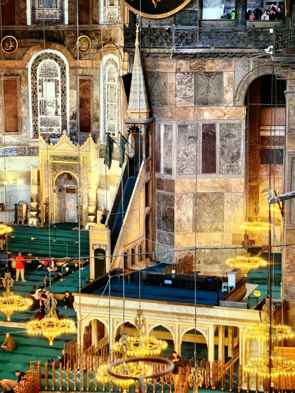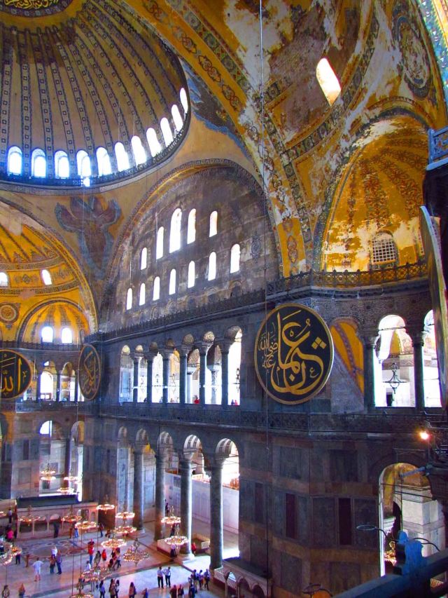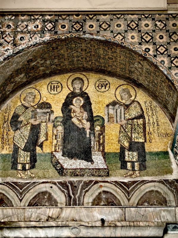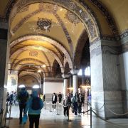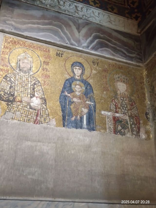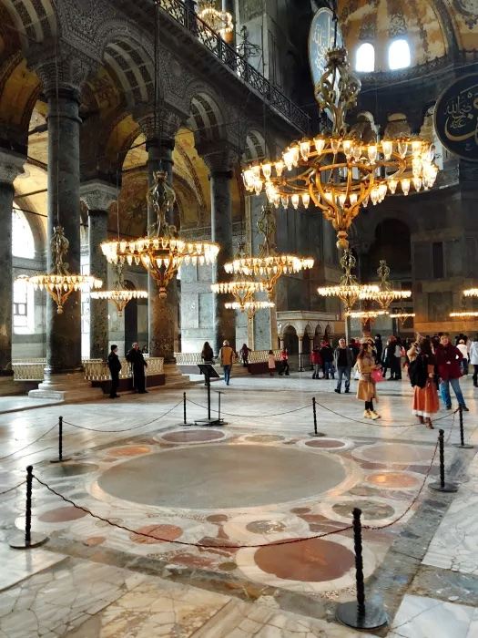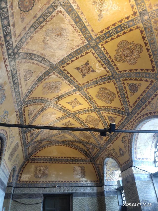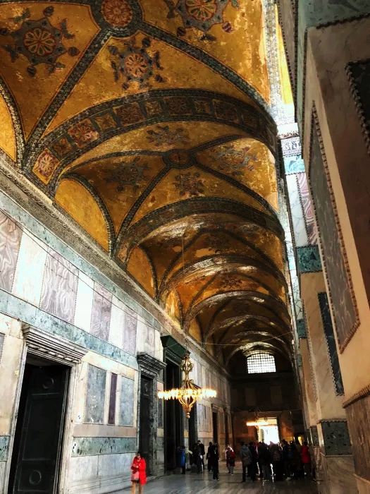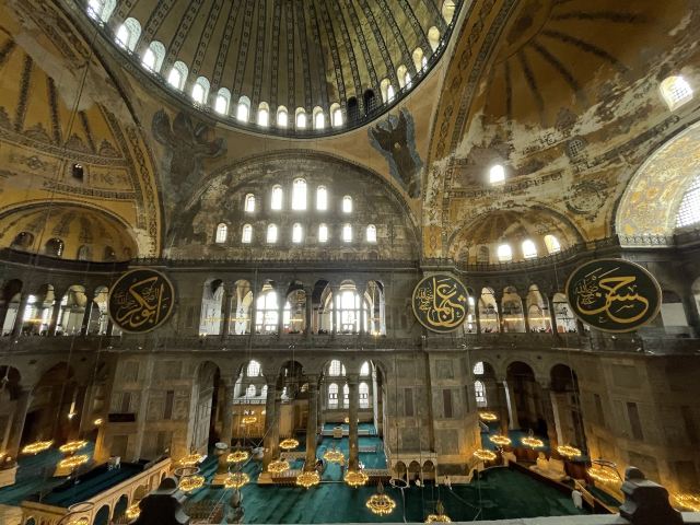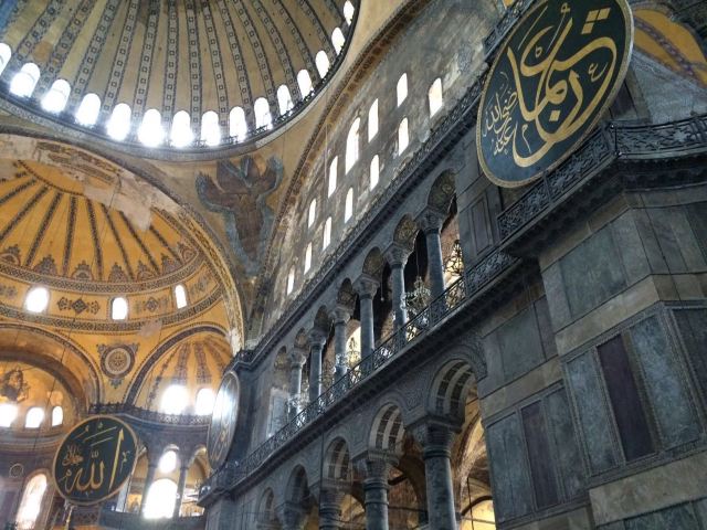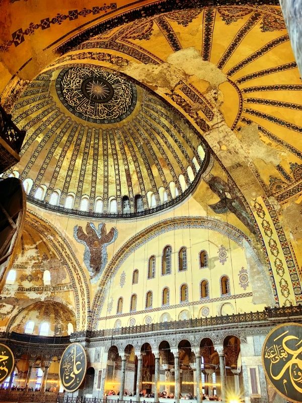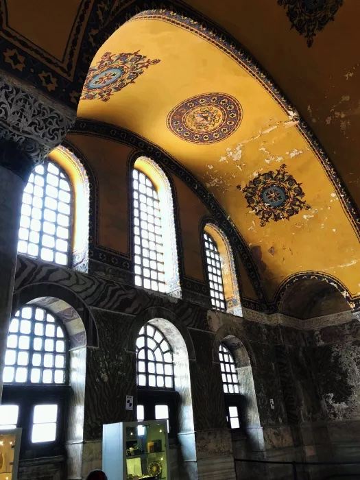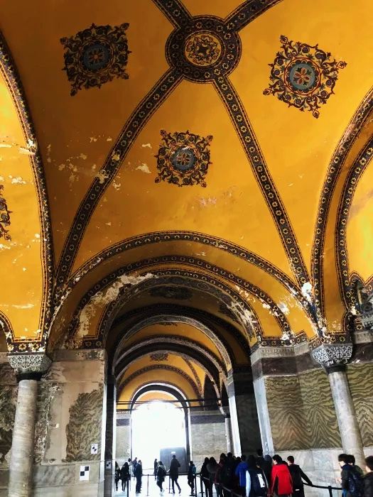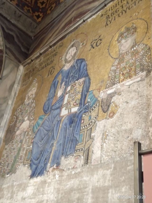 微信小程序阿亚索菲亚大清真寺与蓝色清真寺隔街相望,早期是拜占庭帝国的主教堂,后被土耳其人占领后改建成为清真寺。这是一座土耳其的历史建筑,也是土耳其的象征之一。阿亚索菲亚大清真寺外部是典型的清真寺圆顶和尖塔,在教堂前有一个净洗亭(清真寺用),旁边立着几根顶部雕刻花纹的石柱。通往中央大厅的9道门教堂的前厅中共有9个门通往教堂的中央大厅,其中中间的大门称为“帝王之门”,曾经只有皇帝和皇后才能从这里进入,其左右两侧各有4个门,左右两侧的大门是给普通百姓走的,中间2个大门是给贵族大臣走的。气势恢宏的中央大厅中央大厅内部的地板由多色大理石铺成,墙面上也是彩色大理石镶嵌的图案,显得色彩斑斓。阿亚索菲亚大清真寺里大大小小的隔窗和低垂的吊灯维持着大殿中的光线,而精美的吊灯为大厅带来了温馨的气氛,加上高大的穹顶,让人有种敬畏的感觉。穹顶保留着拜占庭式的壁画,色彩十分丰富。欣赏圣坛和大圆盘教堂的圣坛顶上有着一副圣母子像,俯视着下方。在圣坛左右两侧均有直径约10米的大圆盘,挂着六块黑底阿拉伯金字的大圆盘,大圆盘上写着是人名。这样的圆盘在大厅内共有6个。而圣坛的右侧是加冕处,左侧是讲经的阳台。参观二楼回廊从大厅旁长廊尽头的螺旋通道可以到达二楼,那里是达官贵人和女士们做礼拜的地方。回廊墙壁上有很多描绘基督教故事的壁画。由此俯瞰整个大厅,更能感受到大殿气势宏伟的空间设计。柱头、柱基和柱身的交接线处,都是以金色和蓝色作底色的艳丽纹饰装点着。而柱头精细的雕琢,令人叹服。走在二楼的回廊上,右侧为“皇后包厢”,其下方就是一楼进门处的“帝王大门”。站在二楼可以清楚的看见大门上方镶嵌有精美的马赛克画。