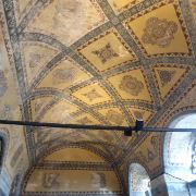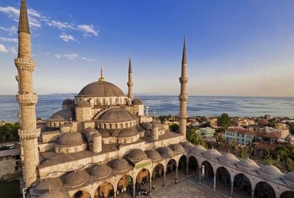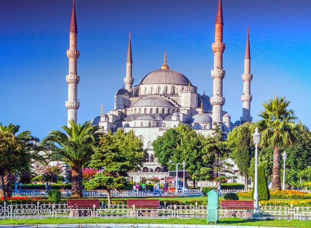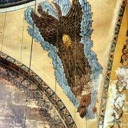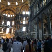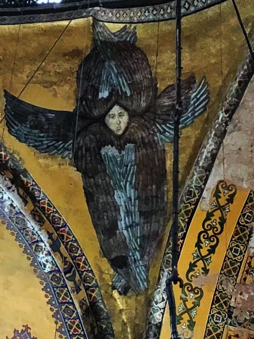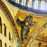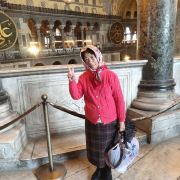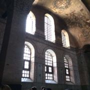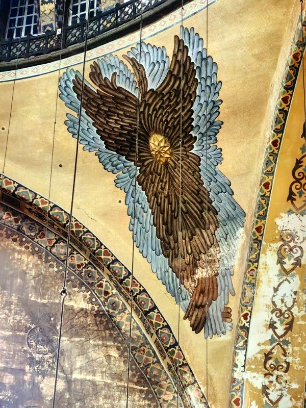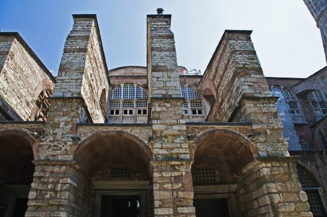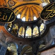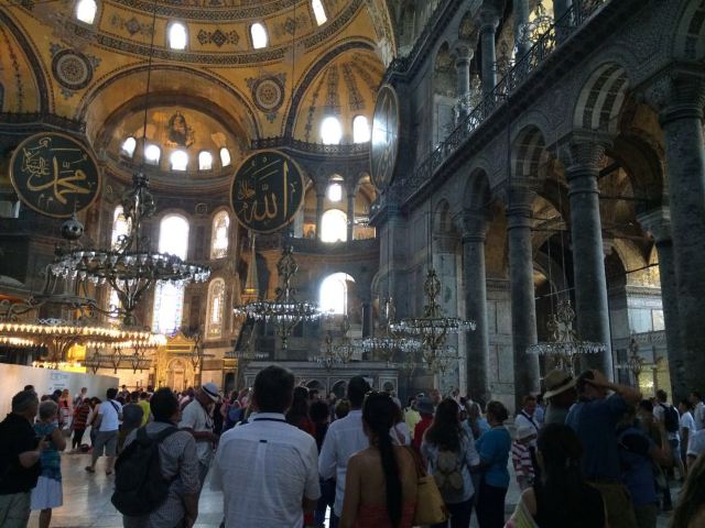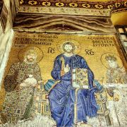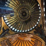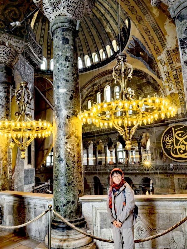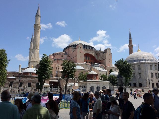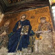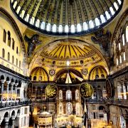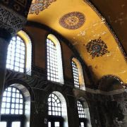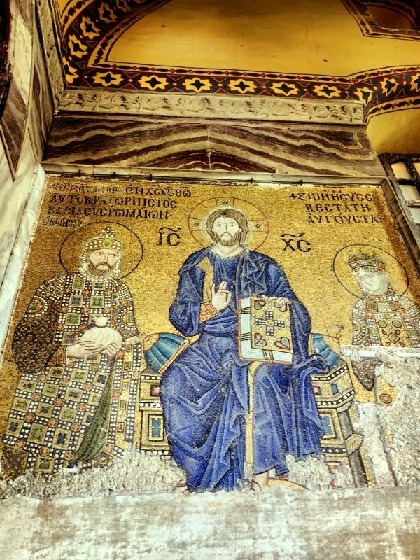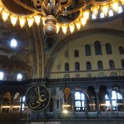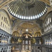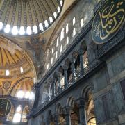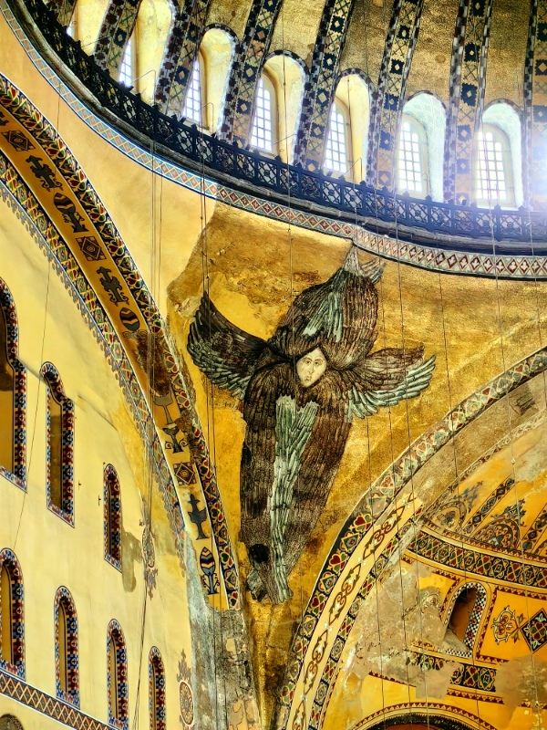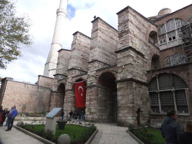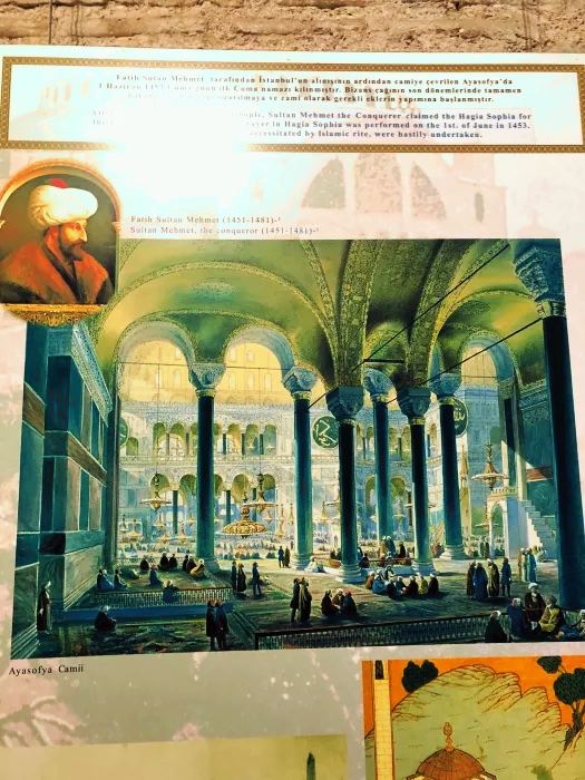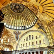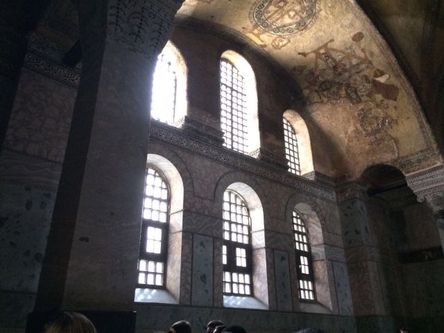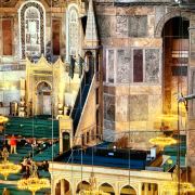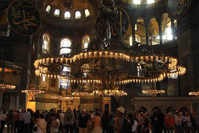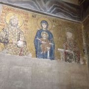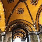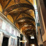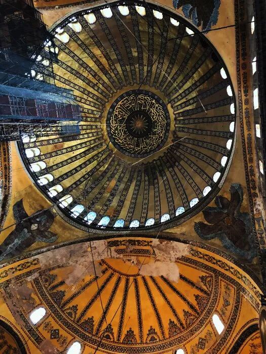 微信小程序阿亚索菲亚大清真寺与蓝色清真寺隔街相望,早期是拜占庭帝国的主教堂,后被土耳其人占领后改建成为清真寺。这是一座土耳其的历史建筑,也是土耳其的象征之一。阿亚索菲亚大清真寺外部是典型的清真寺圆顶和尖塔,在教堂前有一个净洗亭(清真寺用),旁边立着几根顶部雕刻花纹的石柱。通往中央大厅的9道门教堂的前厅中共有9个门通往教堂的中央大厅,其中中间的大门称为“帝王之门”,曾经只有皇帝和皇后才能从这里进入,其左右两侧各有4个门,左右两侧的大门是给普通百姓走的,中间2个大门是给贵族大臣走的。气势恢宏的中央大厅中央大厅内部的地板由多色大理石铺成,墙面上也是彩色大理石镶嵌的图案,显得色彩斑斓。阿亚索菲亚大清真寺里大大小小的隔窗和低垂的吊灯维持着大殿中的光线,而精美的吊灯为大厅带来了温馨的气氛,加上高大的穹顶,让人有种敬畏的感觉。穹顶保留着拜占庭式的壁画,色彩十分丰富。欣赏圣坛和大圆盘教堂的圣坛顶上有着一副圣母子像,俯视着下方。在圣坛左右两侧均有直径约10米的大圆盘,挂着六块黑底阿拉伯金字的大圆盘,大圆盘上写着是人名。这样的圆盘在大厅内共有6个。而圣坛的右侧是加冕处,左侧是讲经的阳台。参观二楼回廊从大厅旁长廊尽头的螺旋通道可以到达二楼,那里是达官贵人和女士们做礼拜的地方。回廊墙壁上有很多描绘基督教故事的壁画。由此俯瞰整个大厅,更能感受到大殿气势宏伟的空间设计。柱头、柱基和柱身的交接线处,都是以金色和蓝色作底色的艳丽纹饰装点着。而柱头精细的雕琢,令人叹服。走在二楼的回廊上,右侧为“皇后包厢”,其下方就是一楼进门处的“帝王大门”。站在二楼可以清楚的看见大门上方镶嵌有精美的马赛克画。