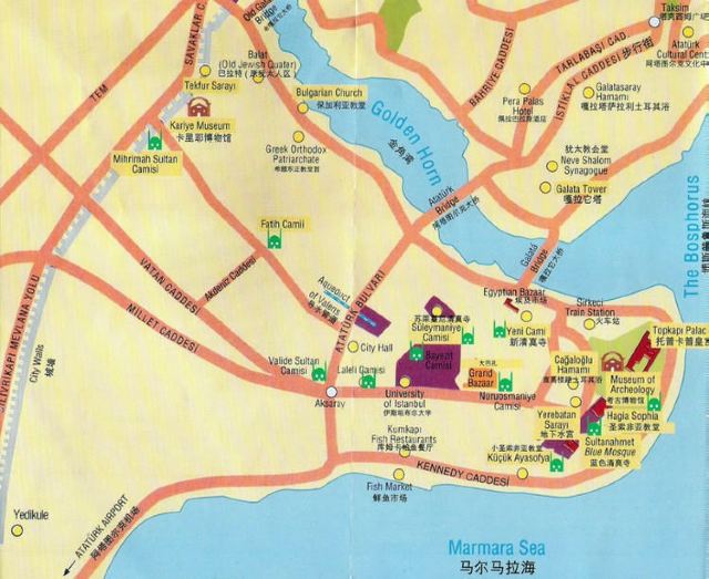 现在金角湾上横架着三座大桥,从入海口上行分别是、阿塔图尔克大桥和。大桥之间近海岸处,井然罗列着公园、绿地和滨海步道,是观赏城市海滨风光的好去处。遥望海湾入海处,隐隐可见的身影。海湾对面,还能远远能看到高耸的。