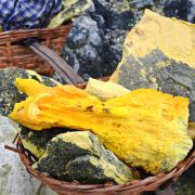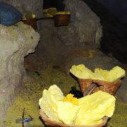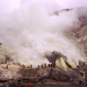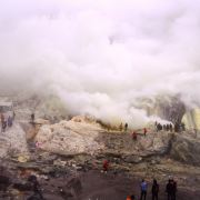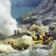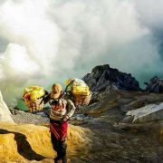 经过重重磨难,当到达火山口边缘看到一团团奇幻般的蓝色火焰时,如此奇景仿佛让我觉得置身外星世界,这般旅行体验真是头一遭体会。不过拍摄到蓝色火焰必须要靠运气,硫磺的烟雾太大太重,火山喷出的气体通过火山口内的喷气孔形成硫磺,当地的矿工则以挖掘和运输这些硫磺矿谋生,矿工们用最原始的方法采集硫磺,他们用围巾或简易口罩遮住口鼻用来抵御火山口喷出的有毒气体,这是他们唯一的防护措施。拍摄他们一般会找你收费30000RP,这是事先并不知道的,但是看到他们如此辛苦和危险的劳作让你很难拒绝。