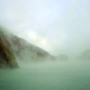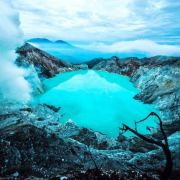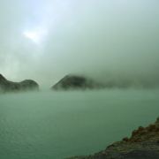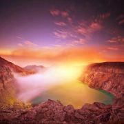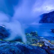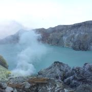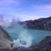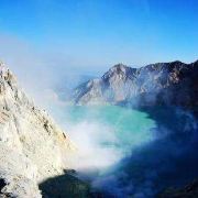 硫磺的烟雾越来越大,但是看完蓝色火焰不要急着回去,在此慢慢的等待天亮,因为伊真火山旁边是一个偌大的硫磺湖,湖水呈淡蓝色,不时有风吹过,滚滚白烟从湖面散开,场面如同仙境。当火山活动加剧时,整个湖面都会沸腾起来,那一刻,你会真正体会到再大的艰险和困难都是值得的。在火山湖畔坐了一阵,继续原路下山,夜爬火山时到处是黑漆漆的一片,而下山时看到的却是伊真火山的另一面,到处烟雾升腾,到处郁郁葱葱,
