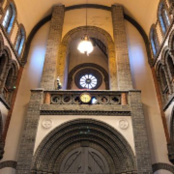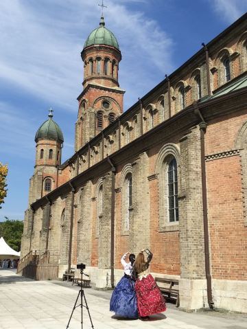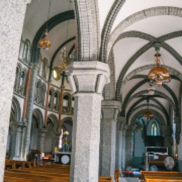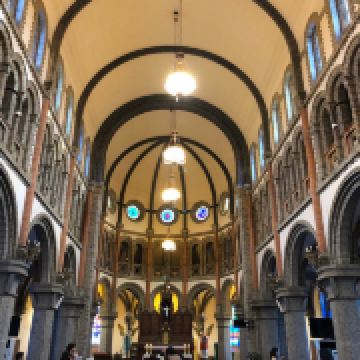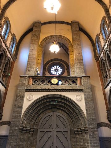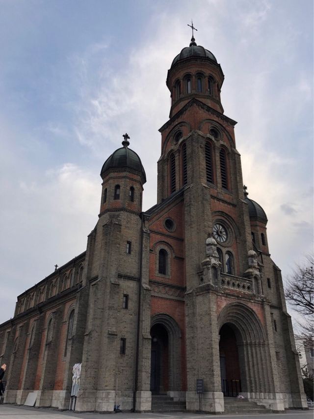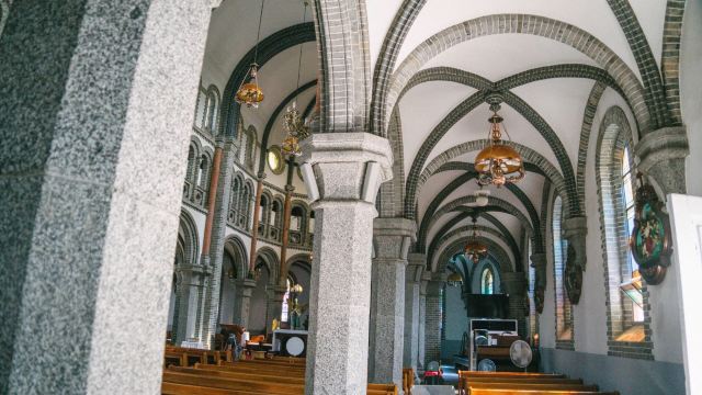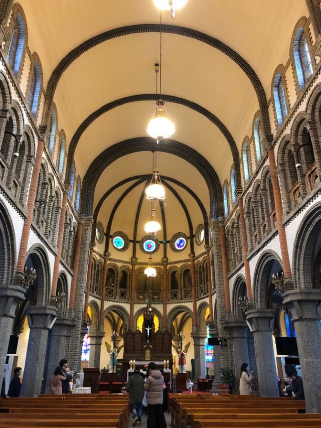 殿洞圣堂座座瓦房高耸入云,完整地保留了罗马的建筑风格。不仅外观特别,内部设计更是精巧好看,仔细看玻璃窗和彩绘的屋顶还有介绍殉教的图画。教堂院内绿化的效果很好,几棵苍翠松柏,几簇野花,角落里都是风景片。教堂内院的左手边有一棵特别粗的大树,直径大概有几十个人围起来宽,年轮层叠浸出岁月的痕迹,足以见其历史悠久,树影斑驳,也是乘凉好去处。