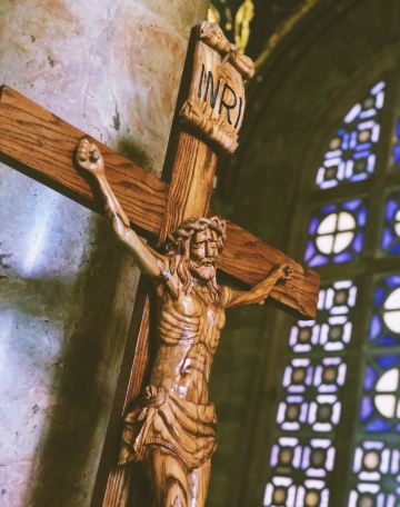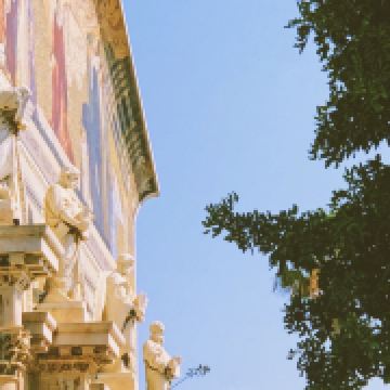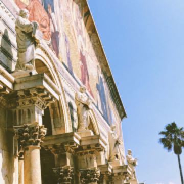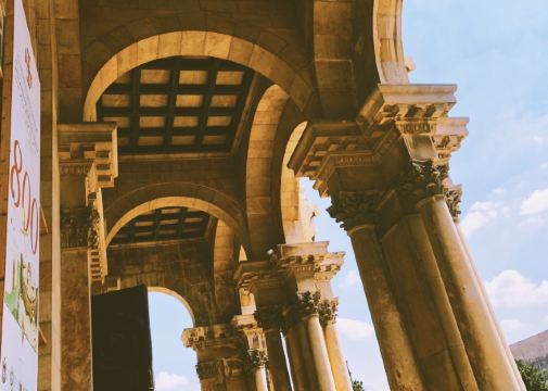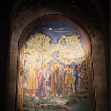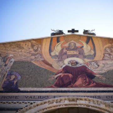 4.教堂的前面有一排列柱,上面是现代的镶嵌图案,描绘耶稣基督象征上帝与人类之间的连接。