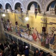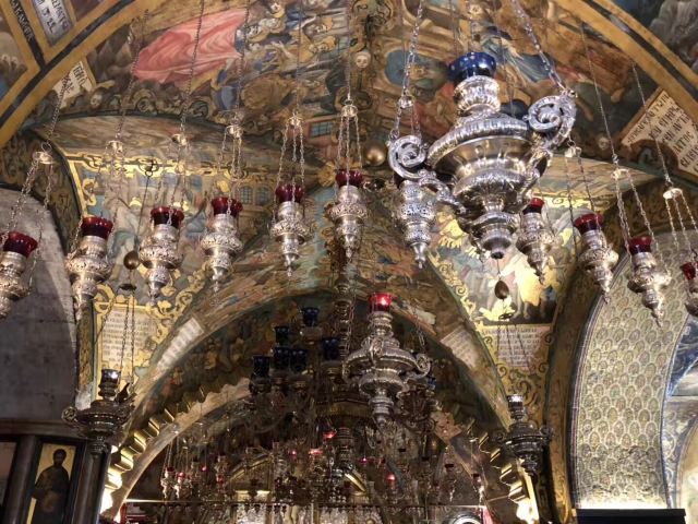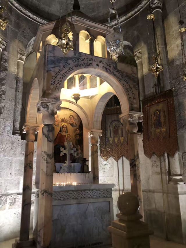 进入教堂,右转上楼,是耶稣被钉上十字架的各各他山,有两幅壁画说的是耶稣被剥去衣服,然后钉上了十字架。一个祭坛,上方是耶稣被钉在十字架上的模型,下方有个耶稣像,像前的一个大理石的圆孔,据说是当初竖十字架的孔。无数教徒和游客排队来摸这个孔。
