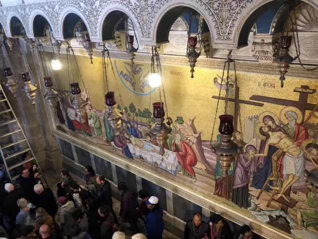 圣墓教堂进门处,一块红色的大理石安放中间。写着耶稣是周五早上9点被钉上十字架的,下午三点,耶稣大声叫喊神后就断气了。这时民众都相信了耶稣真的是主的儿子,是来拯救他们的弥赛亚。于是人们把他从十字架上解下来,安放在这块大理石上涂抹膏油,准备安葬。大理石石床后面墙上的壁画上详细描绘了当时的情景。