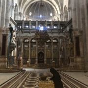 往左就是苦路的最后一站—耶稣墓。当时耶稣被安葬于此,三天后复活。里面还有当初墓上的大理石。