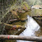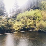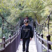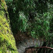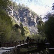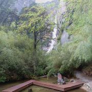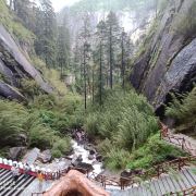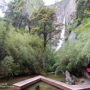 4、再向前经过“飞涧桥”(通往右侧山林步行道的吊桥,另一端连接许愿池,颜值高适合拍照)、“碧竹潭”(被竹林包裹的小谭,潭底铺满竹子落叶,很有意境适合拍照)后到达天佛瀑布。
