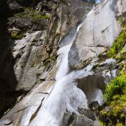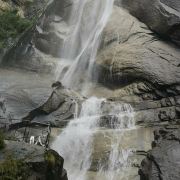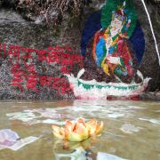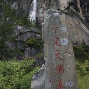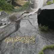 5、天佛瀑布分上、中、下3个观景台,下方观景台能照到瀑布全貌,大部分游客到这里就止步了;花1分钟上几十级石梯便到瀑布正下方的中观景台,瀑布是沿着几阶石崖分段流下来的,不是倾泻而下,所以不会溅湿衣服。山崖上有金色的藏文;再走几个石阶到上观景台,从上往下可拍到山谷全貌。这里有条向西的小路下到拜佛台,因导游催得紧就没走,遗憾。