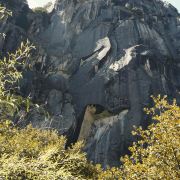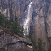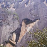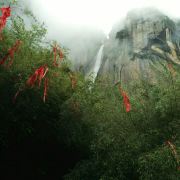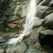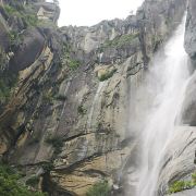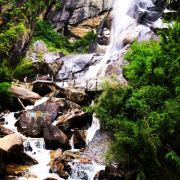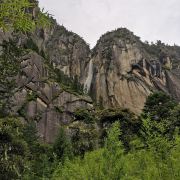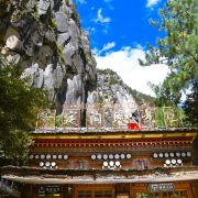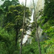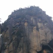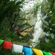 沿着景区内铺设的台阶,走上观瀑,银链般的水流挂在山崖上,非常壮观。瀑布水小时如银链飘然而下,水大时气势磅礴、惊心动魄。瀑布后的岩壁上有自然形成的佛像,据说这是林芝地区藏族同胞的保护神,面目清晰,仿佛人为雕刻的一般。佛像两侧有男女护法各一,也都神态庄严惟妙惟肖。右侧的女护法班丹拉姆高约100多米,依稀可以看出头戴面纱,腰系丝带、手持佛珠,其形象栩栩如生;左侧是济公拜佛,形象也一样逼真。