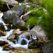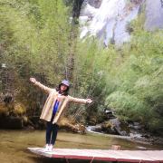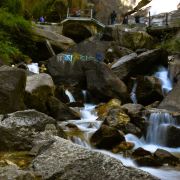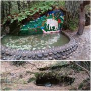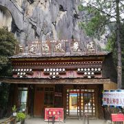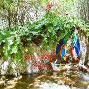 2、进门后有左侧木桥、右侧石路共2条主路通向最深处的主要景观“天佛瀑布”,导游带我们走的石路,沿路上途径“酥油灯”(岩石图案像一盏酥油灯)、“班丹拉姆”(佛教女神的名字,岩石形状酷似这位蒙着面纱的女神,位于在天佛瀑布旁),“强巴佛”(岩石形状酷似藏传佛教里的未来佛--强八佛,也在天佛瀑布旁)、“神鹰献宝”(岩石形状酷似一只鹰叼着一颗宝石)等岩石景观,以及“许愿池”(一个有藏文彩绘的小池子,里面飘着不少零钱)、“圣水潭”(一个小水潭,并形成人工瀑布)、狗熊洞(不是景观,是一土洞,问导游后才知道是狗熊洞)。“休闲娱乐区”空空如也啥都没有,但是可以下到河岸玩水。