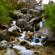 一路走来,峡谷两侧山高崖陡,叠嶂起伏,苍松巨柏遍布山崖。藤竹布满沟底,杜鹃等几十种野花飘香,天气晴好时简直美不胜收。