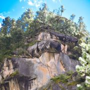 3、到达中部的“拜佛台”,因为天佛瀑布悬崖上有个天然形成的观音托瓶倒水的岩石图案,因此瀑布被藏民认为是观音宝瓶里倒出的水,而被赋予了宗教意义。因此藏民信徒每年来祭拜并取水都在拜佛台休整,游客在此可自愿花10元祈福。另外,从这里通往天佛瀑布的石梯只能上去不能下来,回来时要从另一边走,佛家里这是有讲究的。