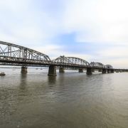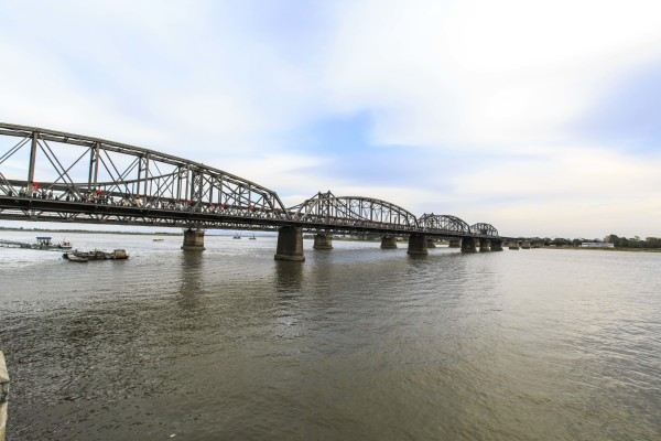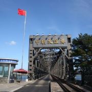 集安国境铁路大桥位于吉林省集安市区内东15公里,鸭绿江国境铁路大桥由日本东亚土木会社承建,于1939年9月1日正式通车。全长589.23米,宽5米,高16米,共二十孔。是双方以第十一桥墩接轨线划为各自维修界线,其中,中方324.23米,朝方为265米。双方分设哨兵、警卫。