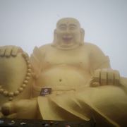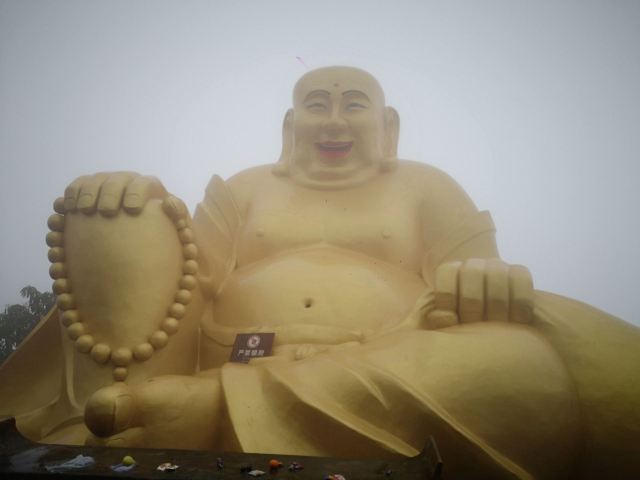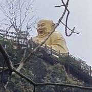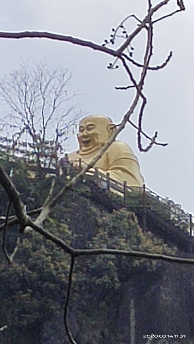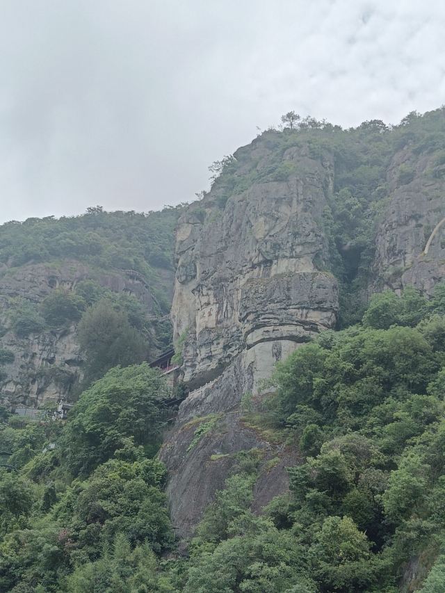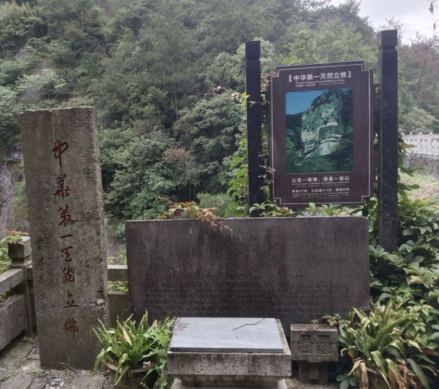 在山下远远就能看到山顶金闪闪的双面佛像,下了索道,走一小段山路便是悬空栈道。栈道上是拍摄大慈岩风景区主要建筑全景的不错机位,不要错过。走过栈道,也别忘了回头拍一张栈道的近照,贴在山腰的飞檐廊亭也算的上大慈岩风景区的标志景观。继续往前走一会儿,天然立佛是这里的又一特色:从侧面看,整个大慈岩风景区主峰像极了一尊地藏王菩萨的立像。奇石、怪洞、草木和谐地组合成大佛的五官,游人到此都无例外地要驻足观赏一番。