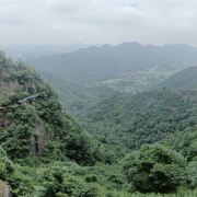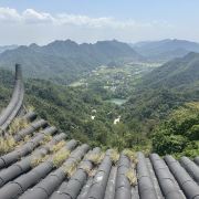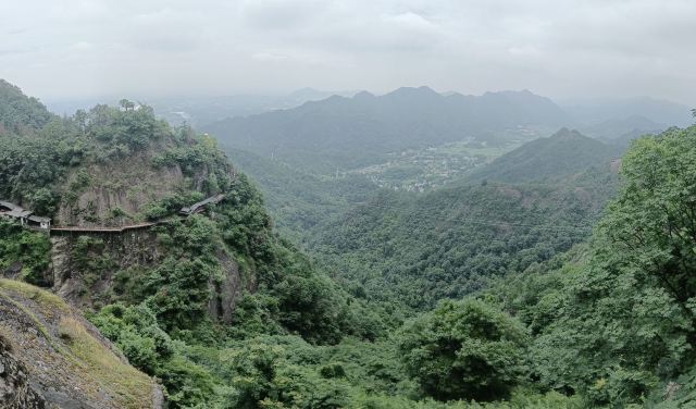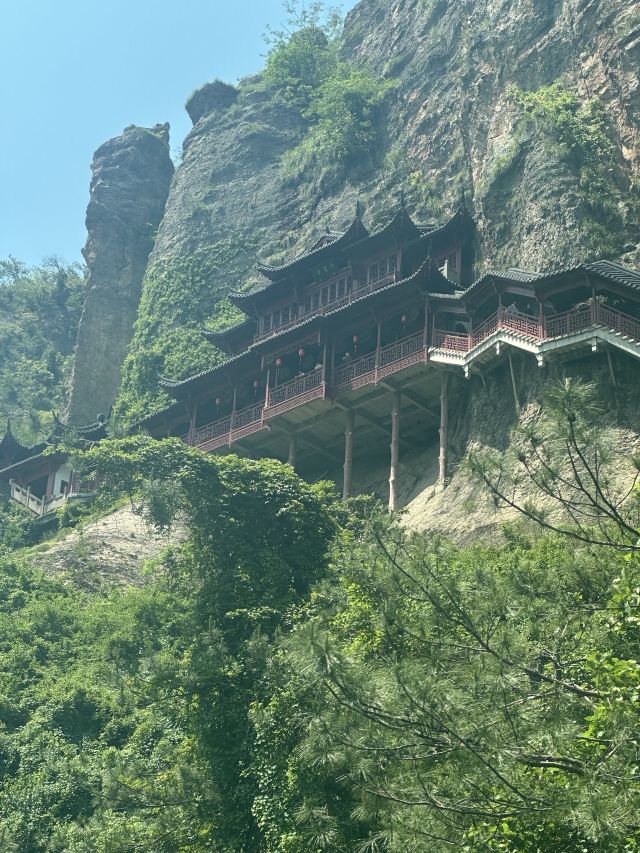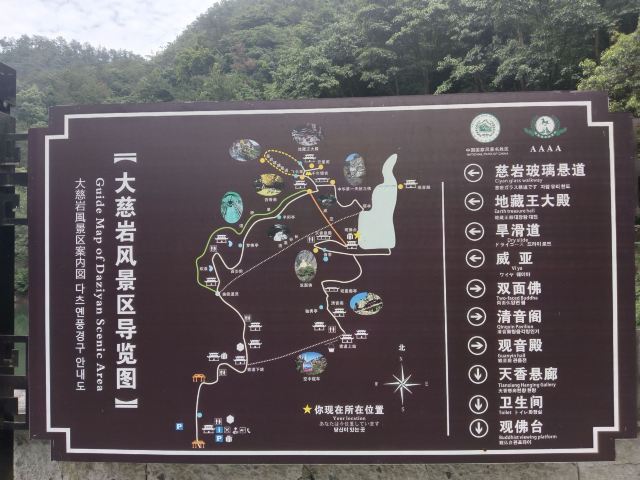 景区内的游览路线大致是个环形,游玩大慈岩风景区,推荐坐索道上山,而后逆时针步行下山,省时省力。上山后还有上上下下的山路要走,有些地方没有遮挡,夏天会比较晒。整个游览的乐趣是顺着曲曲折折的栈道行走在崖壁边,欣赏嵌在山里的步道、寺庙、佛像,以及远处山下绵延的青山和山下渺小的城镇,景象十分壮观。