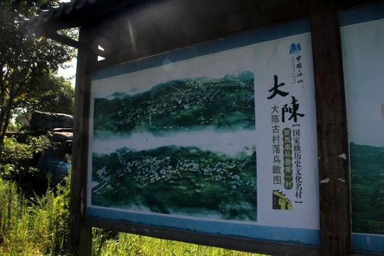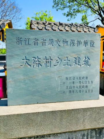 大陈村在江山市区西北10公里处的大陈乡政府所在地。这个拥有着600年历史、被近代有名史学家、鉴赏家、书画家和法学家余绍宋(樾园)誉为“十里环山皆松树,天下应无第二园”的地方,旧以经商办学扬名;近年,又以弘扬传统文化和中国村歌发源地闻名遐迩。在2017年11月大陈村获评第五届全国文明村镇。