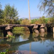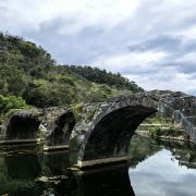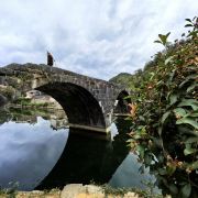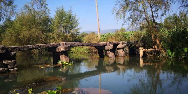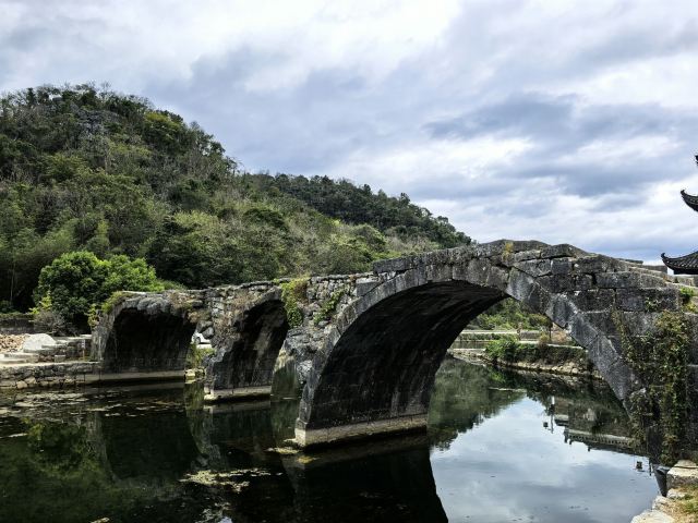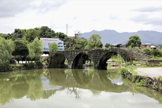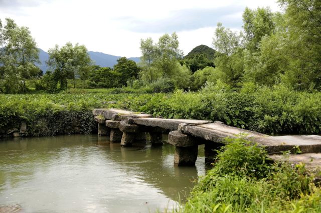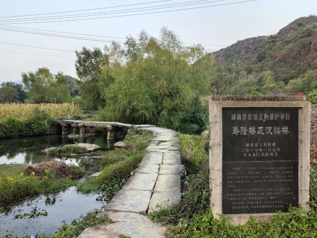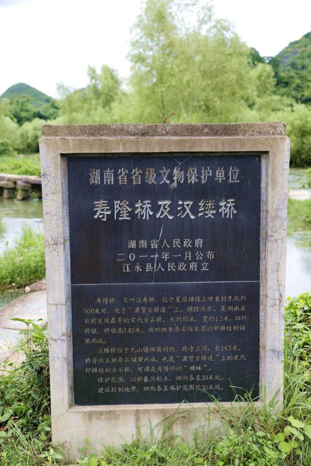 专家考证寿隆桥应该是始建于北宋靖康年间,重建于明成化年间。石桥位于潇贺古道上,这条古道北联潇水,南结贺江,在历史上是中原沟通岭南的重要 通道 之一,青石板铺就的驿道至今仍有保存。寿隆桥以及古桥所在的上甘棠村便是这条古驿道上的必经之路。寿隆桥横跨沐水,长约10米,宽1米左右,5墩4孔,看起来是一座普普通通的石桥,但仔细观察便能看出“名堂”来。这座石桥不是常见的拱桥,而是采用了卯榫结构,每个桥墩均由三块长条石呈子母榫上下、左右拼拢围砌,在一块长石条上凿两个洞,把两个长条石套在洞里做成两个脚,然后把一块大石板放在两个石脚之上,就像是八字形板凳腿,整座桥看起来也像一条长长的石板凳,所以也叫“板凳桥”。不用水泥砂浆,仅仅用卯榫结构,靠几块长条石间的重力原理便使得古桥屹立千年。卯榫结构本用于木构建筑,在桥梁上使用尚属少见,是我国古代桥梁建造由木结构向石结构过渡的珍贵实物例证。