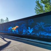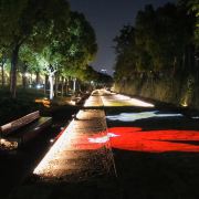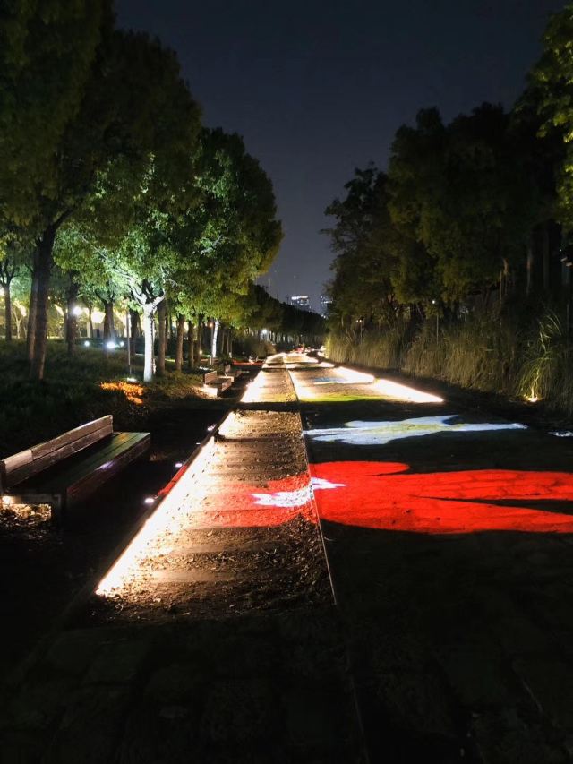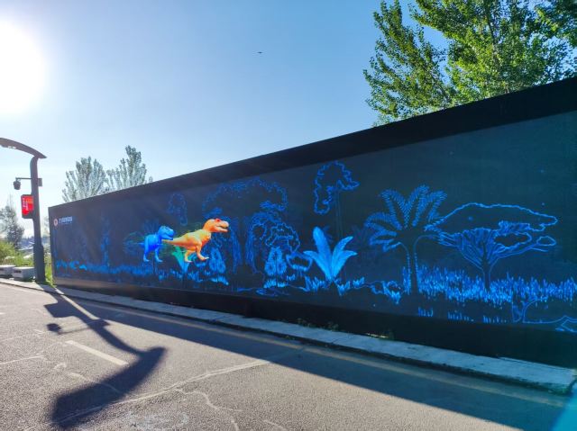荧光步道上设计了丰富多样的恐龙元素图案,在夜晚可以发出柔和的荧光;恐龙陪跑墙其实就是一块LED大屏,结合嘉荫特色,显示的是恐龙打招呼与奔跑的画面;绿道还设计了互动投影功能,孩子们可以通过与投影成像互动,在地面上实现踢足球、消消乐等互动,成为儿童晚间奔跑、游玩的新去处,为恐龙之乡嘉荫县增添了一道靓丽的风景线。