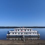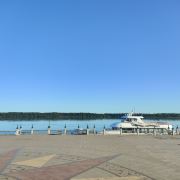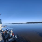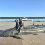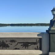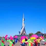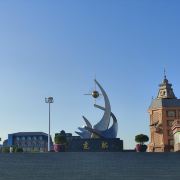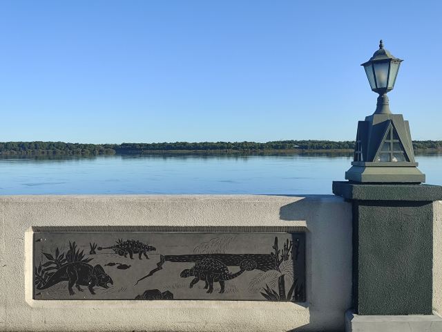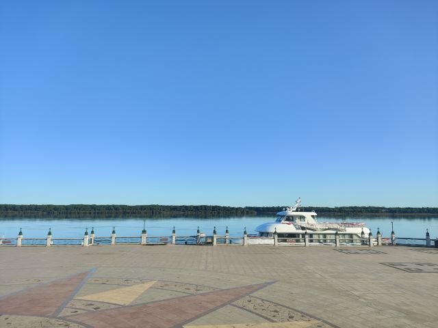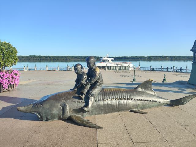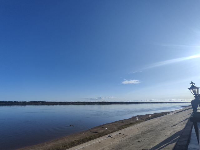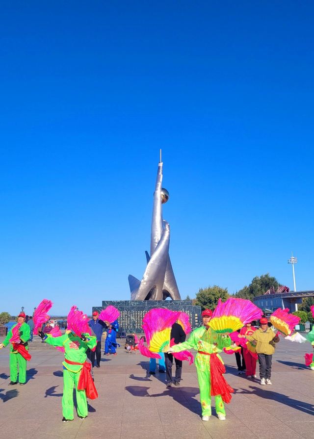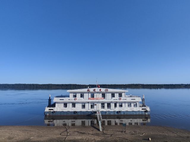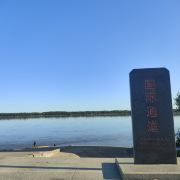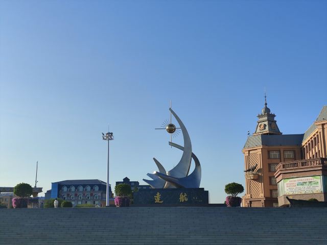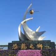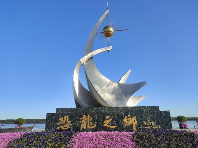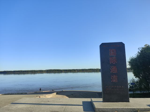 道路尽头,映入眼帘的首先是恐龙之乡的地标雕塑,背面有黑龙江省前省长陈雷题词的远航二字。雕塑后边的台阶下去是下沉广场,广场前方就是宽阔的黑龙江。夏季水量很大却很清,倒映着蓝天,江水很蓝,拍照很漂亮。江对面就是俄罗斯,江上有游船穿梭,可以带客人近距离欣赏俄罗斯边境风光。