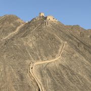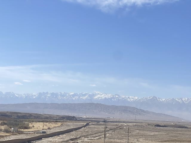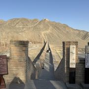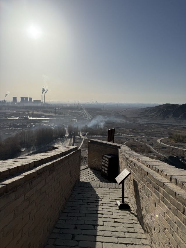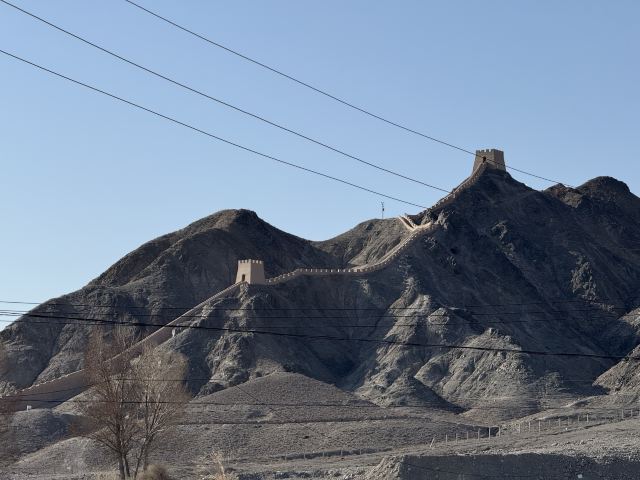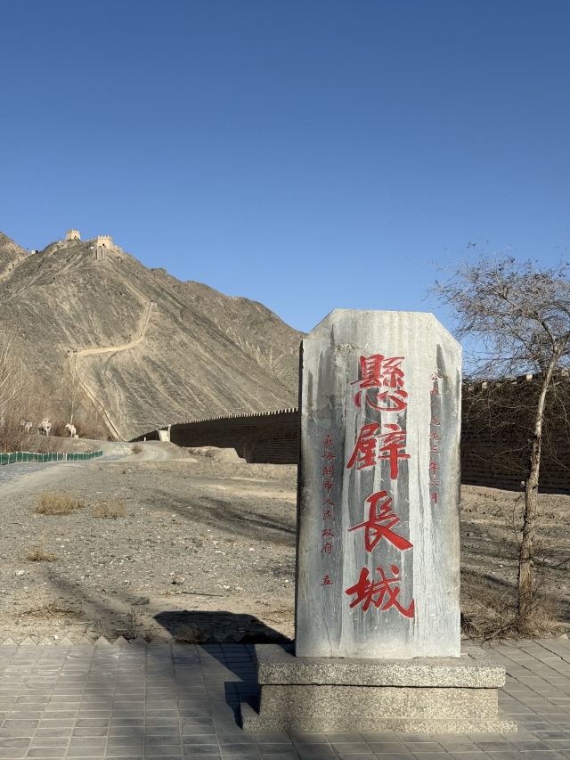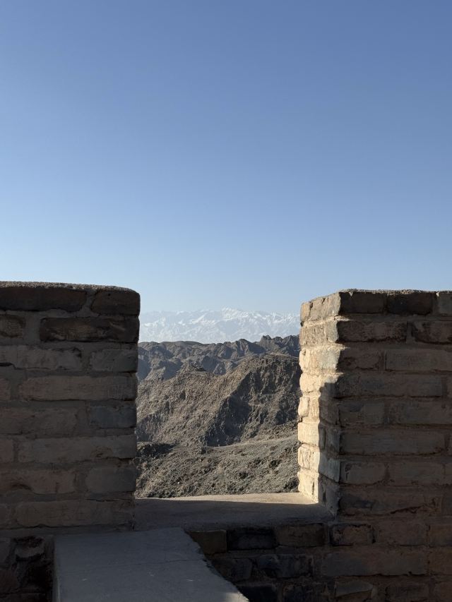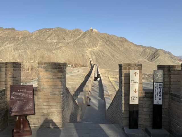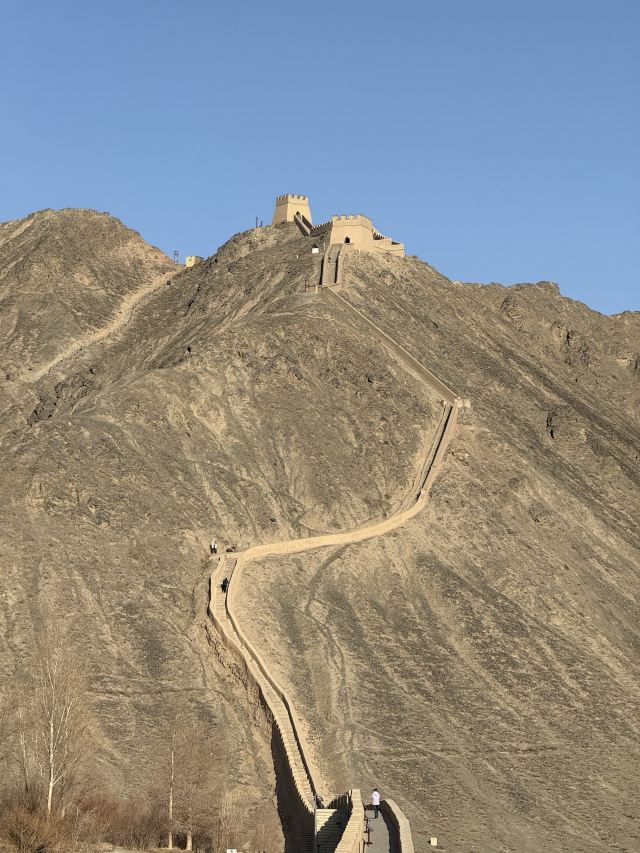 进去就能看到长城从山脚一直修到山顶,看着挺壮观。坡度也不是很陡,就是爬起来有点累,慢慢走还行。一路往上,回头就能看到戈壁滩和远处的雪山,视野很开阔。