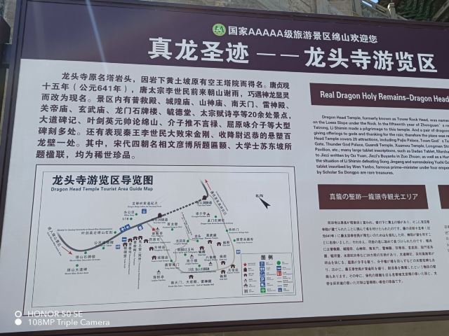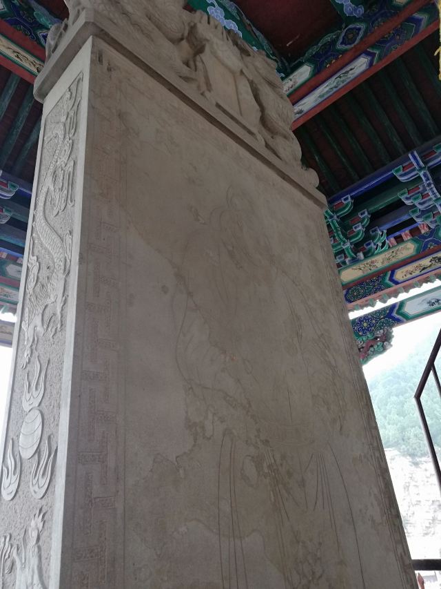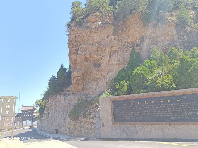 龙头寺景区是坐观光车从绵山票务中心出发到达的第一个景点,这里有好多可看的景点,如:南天门,唐营,关帝庙,真武庙,太宗赋诗亭等。在太宗赋诗亭有一块大石碑,石碑后边是太宗赋的诗,前边是太宗的画像,白线条的,很细,所以要仔细看才可以看出来。太宗画像显示太宗富态又潇洒且庸荣华贵。