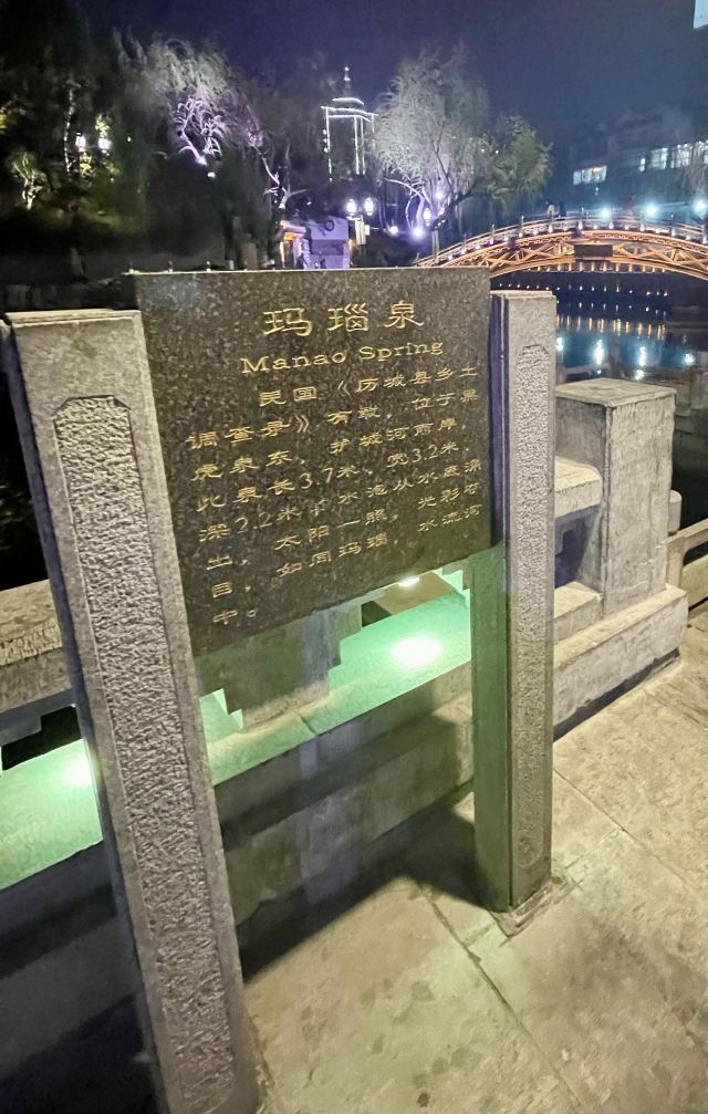 玛瑙泉处于温带大陆性季风气候,盛水时,数处泉眼竞涌, 串串水泡从池底冒出, 在阳光照射下光彩夺目,状如玛瑙。泉水溢满后,从北池壁高出河水0.5米的6个方形洞孔中流落于护城河里。