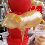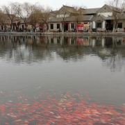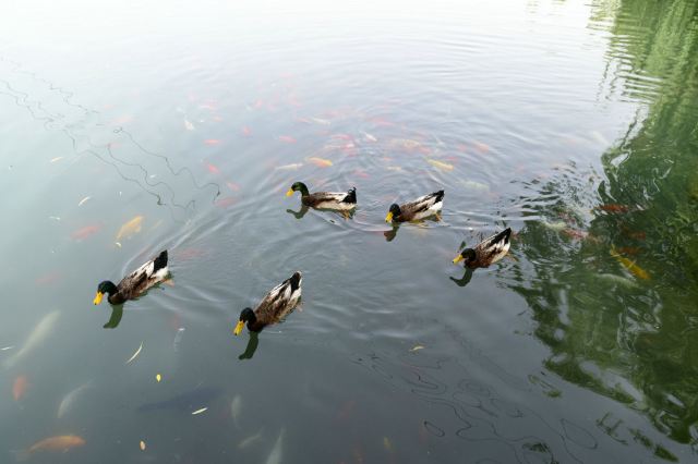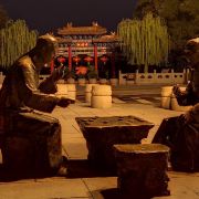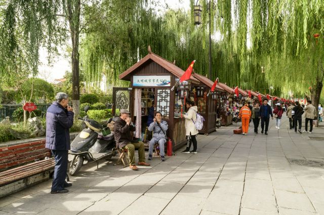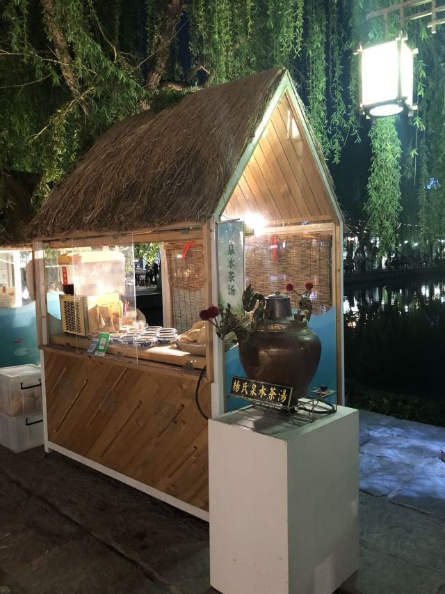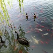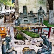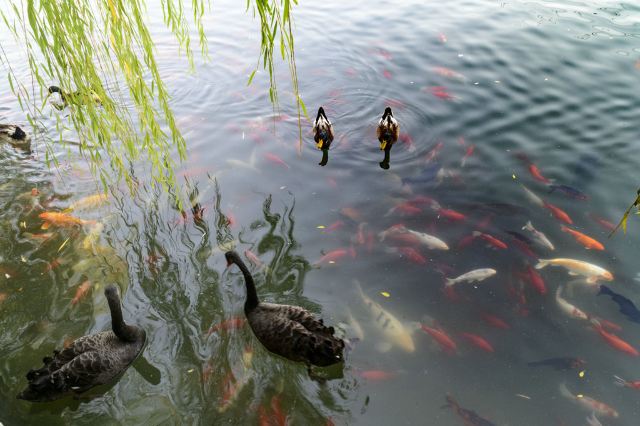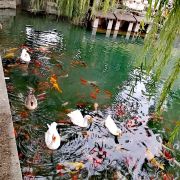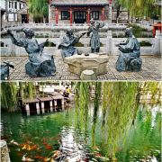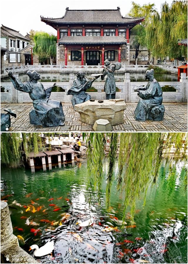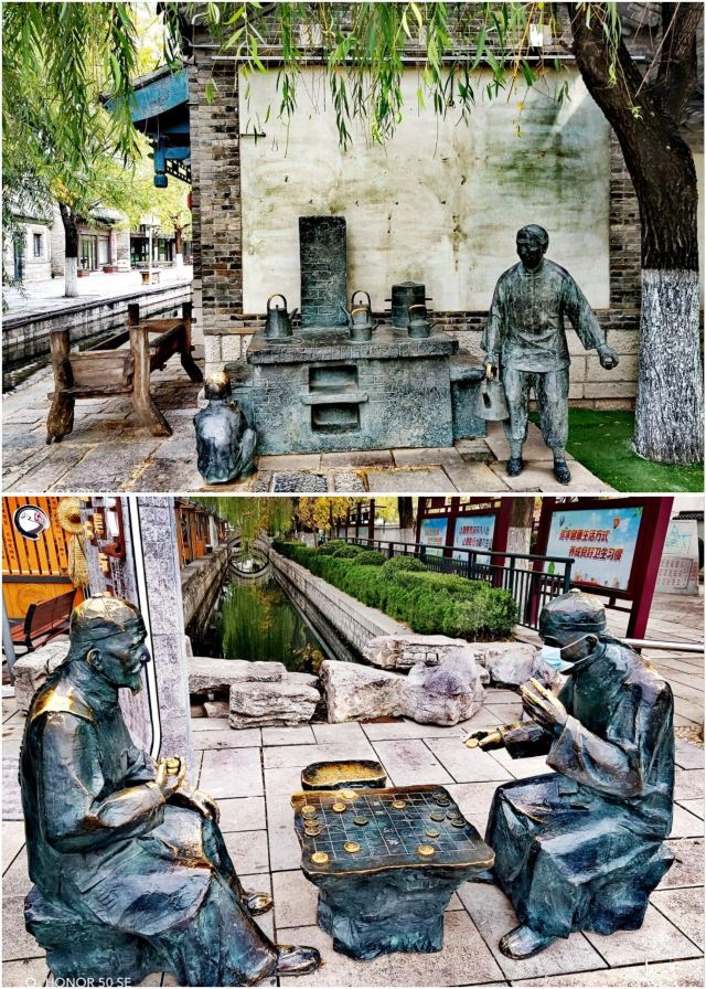 3、环湖西侧是“曲水亭街”,目前被打造成民俗文化市场,是一排摊位,工艺品为主,小吃为辅,有卖鱼食的,湖中锦鲤、鸭子、白鹅等生灵成群结队与游人互动,手握鱼食会被它们如影随形,享受着明星般的待遇。西北角的主门门口的对弈铜雕很有韵味适合拍照,其中一个还被戴上了口罩,全景区类似反映济南古时百姓生活的雕塑很多,让人仿佛穿越回了过去。
