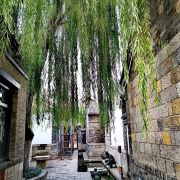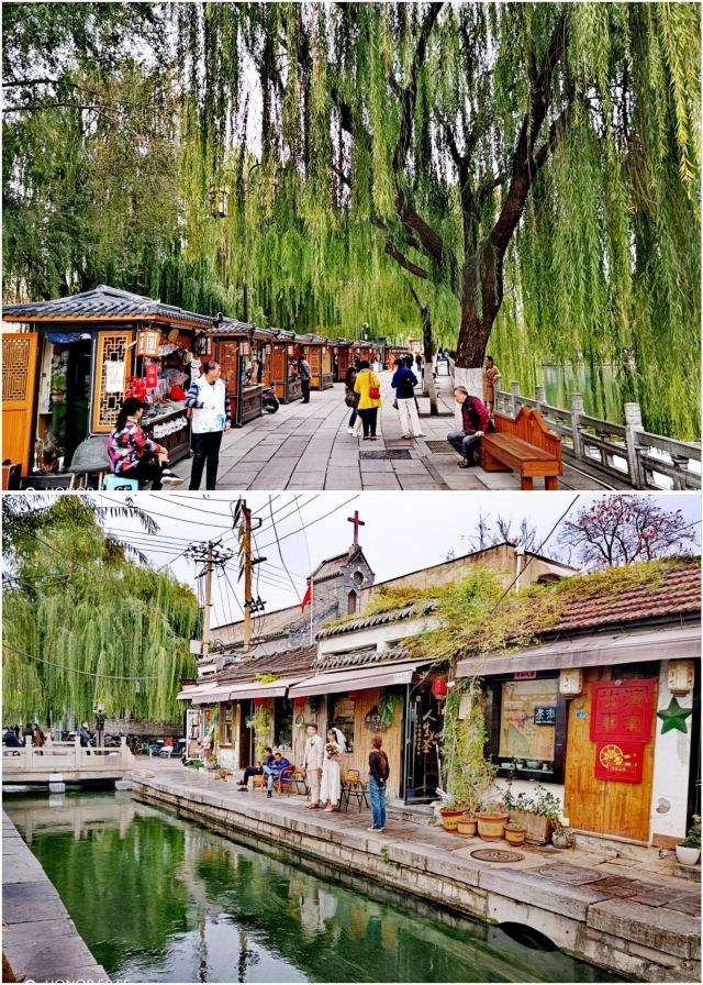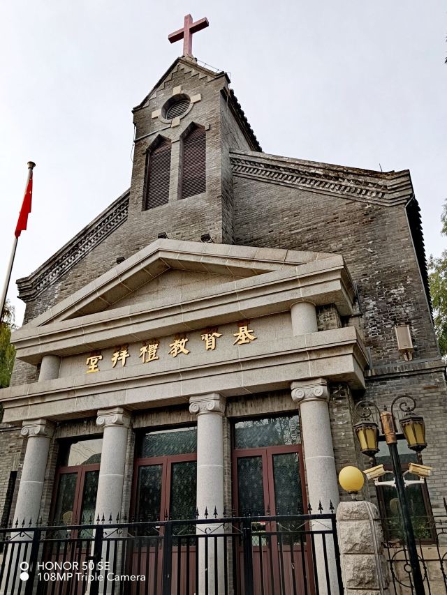 4、环湖南侧是“后宰门街”,“后宰门”原为明德王府的北门,街以此命名,街上的“基督教后宰门教堂”高耸神圣,是打卡拍照点,该欧式教堂始建于1937年,原是基督教美国南浸会下辖的一个诊所,1937年日军侵占济南后,把济南划分为城内“商埠区”和“城外区”,城内基督徒到城外教堂做礼拜时要向守城的日本兵行礼,基督徒难以接受便出资将此诊所改建成礼拜堂。新中国成立后美国教士撤走,由中国牧师接管教堂事务,直至文革期间教堂改成为机关宿舍,1985年政府将教会房产返还,于次年复活节恢复了宗教活动。1993年礼拜堂改建为眼下这种两层教堂的布局,可容纳约600人,常住济南的外国信徒也常来此聚会,但目前不开门。教堂两侧分别是“厚德泉”和玉带河,河水便从这流入百花洲,河两侧垂柳婀娜、瓦房整齐排列,不少新人在此拍婚纱照。厚德泉原是一口无名井,2009年在修建景区时被命名,泉名出自《周易》的“厚德载物”,为纪念古时一位在泉边施粥赈灾的富商。泉池呈方形,泉水从中心白色鹅卵石堆中汩汩流出。后宰门原名“厚载门”,泉名刚好与原街名契合…