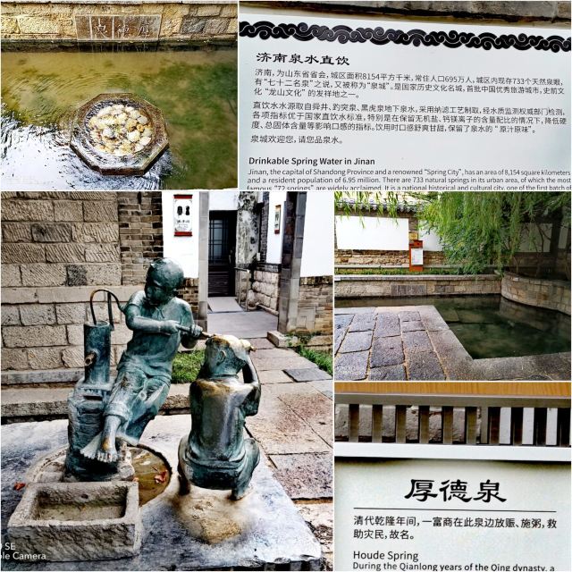 4、环湖南侧是“后宰门街”,“后宰门”原为明德王府的北门,街以此命名,街上的“基督教后宰门教堂”高耸神圣,是打卡拍照点,该欧式教堂始建于1937年,原是基督教美国南浸会下辖的一个诊所,1937年日军侵占济南后,把济南划分为城内“商埠区”和“城外区”,城内基督徒到城外教堂做礼拜时要向守城的日本兵行礼,基督徒难以接受便出资将此诊所改建成礼拜堂。新中国成立后美国教士撤走,由中国牧师接管教堂事务,直至文革期间教堂改成为机关宿舍,1985年政府将教会房产返还,于次年复活节恢复了宗教活动。1993年礼拜堂改建为眼下这种两层教堂的布局,可容纳约600人,常住济南的外国信徒也常来此聚会,但目前不开门。教堂两侧分别是“厚德泉”和玉带河,河水便从这流入百花洲,河两侧垂柳婀娜、瓦房整齐排列,不少新人在此拍婚纱照。厚德泉原是一口无名井,2009年在修建景区时被命名,泉名出自《周易》的“厚德载物”,为纪念古时一位在泉边施粥赈灾的富商。泉池呈方形,泉水从中心白色鹅卵石堆中汩汩流出。后宰门原名“厚载门”,泉名刚好与原街名契合。