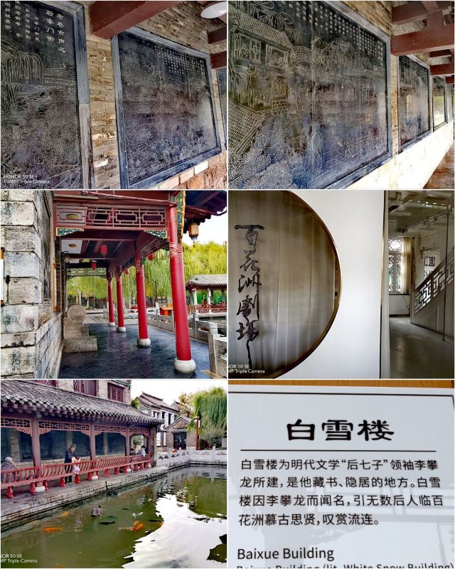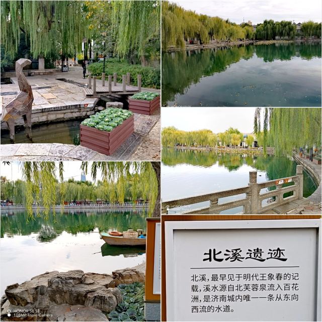 2、北宋熙宁五年(1072年),“唐宋八大家”之一的曾巩任齐州(今济南)知州时,主持在大明湖上修筑了“百花堤”,今天百花洲东岸的民居群在当时是水中小岛,因岛上百花烂漫也被称为“百花台”。至明嘉靖年间,文坛“后七子”领袖、济南籍著名文学家李攀龙辞官后于百花台上建三层楼阁,取名“白雪楼”。景区东北角的“北溪遗迹”中的“北溪”,出自明万历年间南京吏部考功郎、济南籍诗人王象春在《齐音•北溪》诗作中描绘的一条小溪,它是全市唯一一条自东向西流的水路。