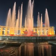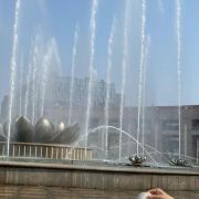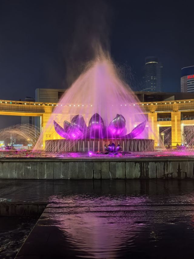 泉城广场东部的荷花音乐喷泉中间是荷花雕像,绕着荷花的喷泉会变幻不同的造型,每场喷泉约30分钟。晚上的喷泉特别好看,灯光不停变幻,适合拍夜景,夏夜又是纳凉的好去处。喷泉东部圆弧形的文化长廊可以登顶,有很好的视野,能拍摄喷泉和泉城广场的全景。