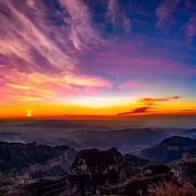 早晨观日出, 太阳从地平线破雾而出, 天上金丝万缕、彩云飞舞。在十几分钟内, 闪变着青、蓝、橙、紫、黄等各种色彩, 悬崖绝壁通体透亮, 古松林间, 光柱闪烁。如果有幸看到云海中的日出, 更是魅力四射