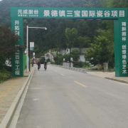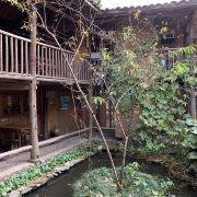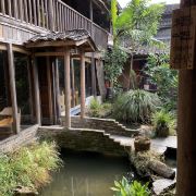 景德镇城东南十余里有一片老式农宅和陶瓷作坊,叫三宝国际陶艺村。整个村子看似普通的很旧的农家小院,进入门内是一个陶泥标志物,里面嵌了很多瓷片、陶艺作品,院子里有从外面引入的小溪,水清见底,躺着的瓷碗、瓷片,有的掩埋了一半在泥里,古老的木制农具和当地的日常用品静静地待在一边,原木的门上贴着的大红春联。原木的长凉亭,原木的农家的米桶是椅子。它随意、简单、毫无章法、却野趣天成。