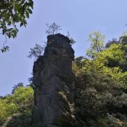 杜鹃山位于茨坪南面,由中峰扬眉峰、西峰望指峰和东峰观岛峰组成。远远望去,山形如笔架,因此又叫作“笔架山”。这里的“十里杜鹃林”为出名,四五月时漫山杜鹃盛开,是井冈山为出彩的自然景观。茨坪总站(游客服务中心)有杜鹃山专线直达景区,车程半小时左右,甚是方便。需要注意的是,杜鹃山大门票包含在井冈山景区门票中,但并没有步道上山,需要乘坐景区索道往返(旺季160元/人,淡季150元/人)。不过,杜鹃山的索道可以说是性价比很高的,单程大约要坐25分钟,在索道上俯瞰下面层叠的青翠山峦,景色很赞。尤其是杜鹃花开的时候,脚下便是一片花海。索道有上中下三站,其中,中站是一个一百多度的大转弯,略感惊险,过了中站便能看到杜鹃山的轮廓了。由索道上站开始步行,20分钟左右走到古柏峰的三岔路,这里是杜鹃山观光的起点和终点。左手一条羊肠小道只有在向导带领下才能进去,右手两条步道,一条是悬空栈道,一条是木质游步道,二者在东面的大小松岛附近连成一个环形。游人通常会往左边的悬空栈道开始顺时针游览。路很好走,可边走边欣赏沿途的风景。悬空栈道正对着笔架山峡谷,沿路有5个观景台,可以观五指峰背面和峡谷景色。其中,东面的五号观景台周边矗立着好几座百余米山峰,站在观景点能远看孔雀峰和石笋峰,景色为壮观。沿路还有将军石等几处象形石,细看确有几分神似。五号观景台后面的大小松岛以奇松云集出名,有观景台供游人拍摄角度佳的奇松景观。小松岛往后走的木质栈道便是观赏“十里杜鹃长廊”的游步道,四五月时沿着步道前行,就如同漫步在杜鹃的海洋之中。这里的杜鹃品种很多,值得一看的是扬眉峰附近的一株“杜鹃王”,它是一株超大型猴头杜鹃,44株杜鹃环绕着一棵伞状的松树,树龄已有千年。后面的游程中,有佛手指天、蛤蟆叫天等几处象形山岩,可欣赏、拍照。一路走到木质栈游步道尽头便回到古柏峰了,原路走回索道上站便可乘索道下山。回程去往茨坪的专线车会路过五马朝天,时间充裕可下车游览。夏天时,杜鹃山下还可以漂流,一般是100元/人。
