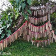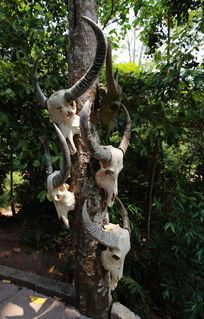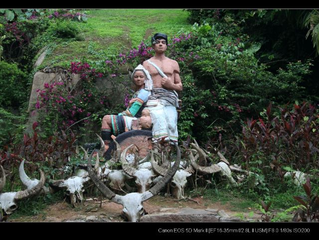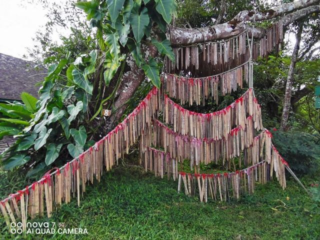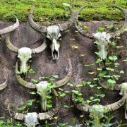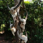 走进基诺山寨,只见路边 树上到处都挂着牛头,牛头代表男子的成年礼,杀一头牛,挂上牛头这个男子就成年了,也意味着可以自由恋爱了。