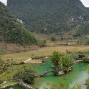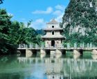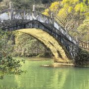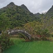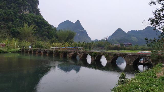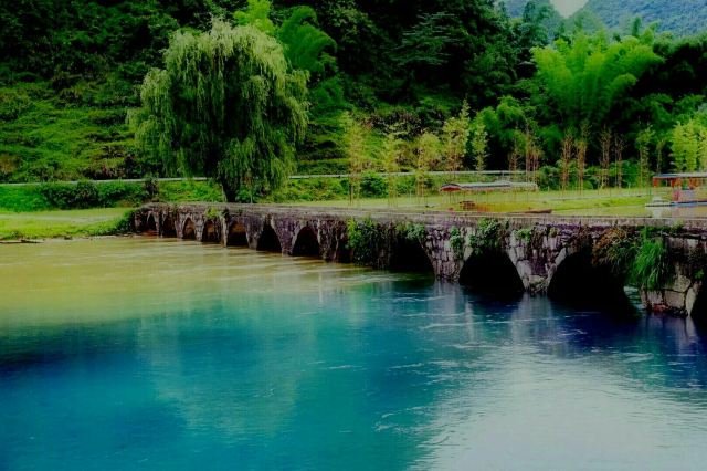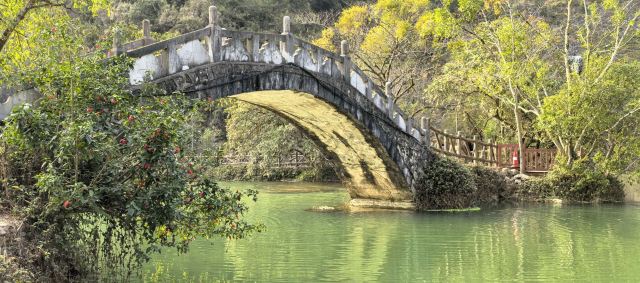 进入景区大门后,沿着河畔走着,一面是高耸的山峰,一面是平坦的农田,而鹅泉就像一块明镜,倒映着两岸美景,让人心醉。再往前便可看到一座15孔拱桥,建于清代,古韵悠悠,时不时有竹排穿过,这也是鹅泉的胜景之一。与这座桥相连的村庄叫念安屯,在这里可以感受到原生态的田园生活气息,泉边浣衣、赶鸭子、放水牛等等。从古屯返回,登上半山的凉亭,举目眺望,青山绿水、石桥翠竹、农田民居,构成一幅美丽画卷,令人流连忘返。