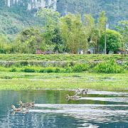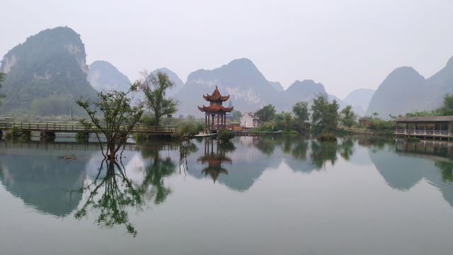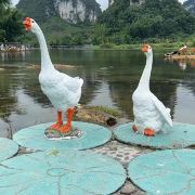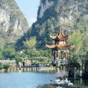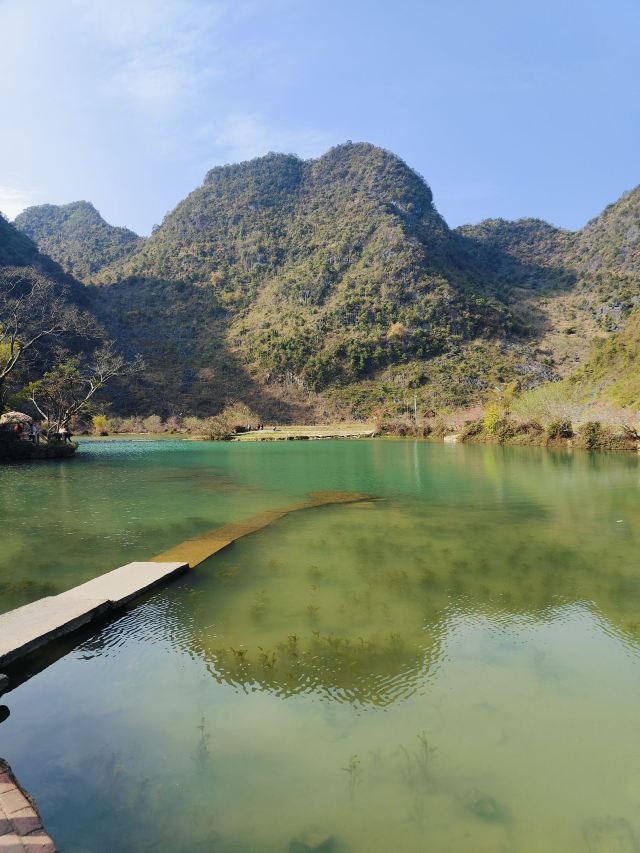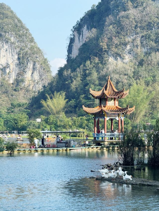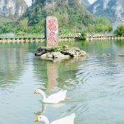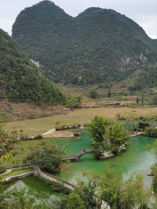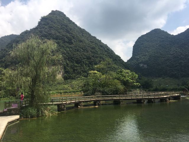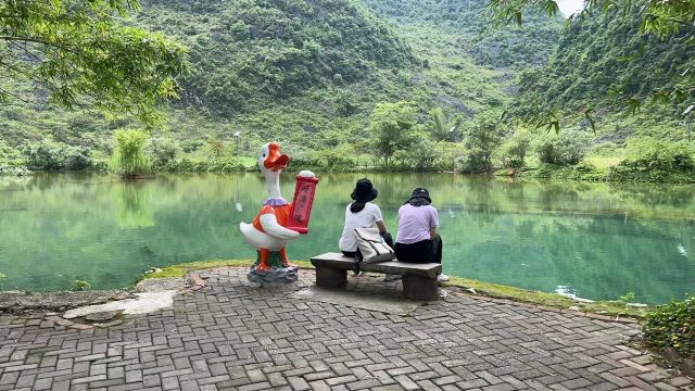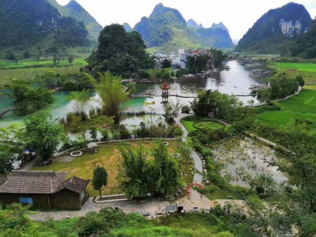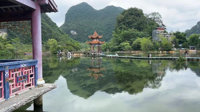 5分 超棒我们下午将近5点入住鹅泉景区门口的民宿,民宿老板温馨提示我们,早上7.30以前进鹅泉景区是免门票的,于是我们早早起床进景区溜达了,鹅泉是靖西八景之一,鹅泉与大理的蝴蝶泉、桂平西山的乳泉并称中国西南部地区三大名泉。鹅泉是一口峰林谷地中的上升泉,面积达50余亩的巨泉,泉水长年不竭,碧水潺潺,汇入深潭,然后继续东流,是德天跨国大瀑布的源头。泉眼处是一汪清澈见底湖水,碧绿如玉,如一块巨大的翡翠镶嵌在长寿坡山下,泉水清澈见底,大群的鱼儿在泉眼附近自由畅玩,鹅泉的的景观设计,将中国传统的园林风格与当地喀斯特地貌完美的融合,青山绿水、亭台楼阁、小桥流水、鱼儿、鸭群在这里是那么的和谐祥宁。长寿坡山上有三个观景台,登高望远,可将鹅泉美景尽收眼底,可惜天气不太给力,照片不足以反映鹅泉美丽的容颜。鹅泉的青头鸭好吃,一定要品尝哦!
