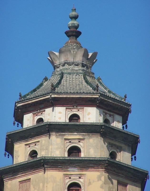 崇文塔为八棱柱体,塔为楼阁式,塔体中空,有螺旋形砖梯400余级直通塔顶。塔顶为铜板制,状似葫芦,上置铁相轮,加塔体全高83米,共13层。各层均有四门四龛,龛内置有石佛,形态各异。有门通往塔上的腰檐,可步出塔体,沿腰檐绕塔浏览。塔顶原暗藏有鎏铜佛造像8尊,现存于泾阳县博物馆。