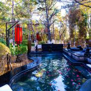 度假区共有10个特色餐厅:云谷温泉美食、云谷雨林餐厅、云上精舍餐厅、湿地汤泉餐厅、青草餐厅、草坪宴会厅、鹤泉船坞商业街、农夫厨房、稻田餐厅等,可出品各色特色餐饮美食。