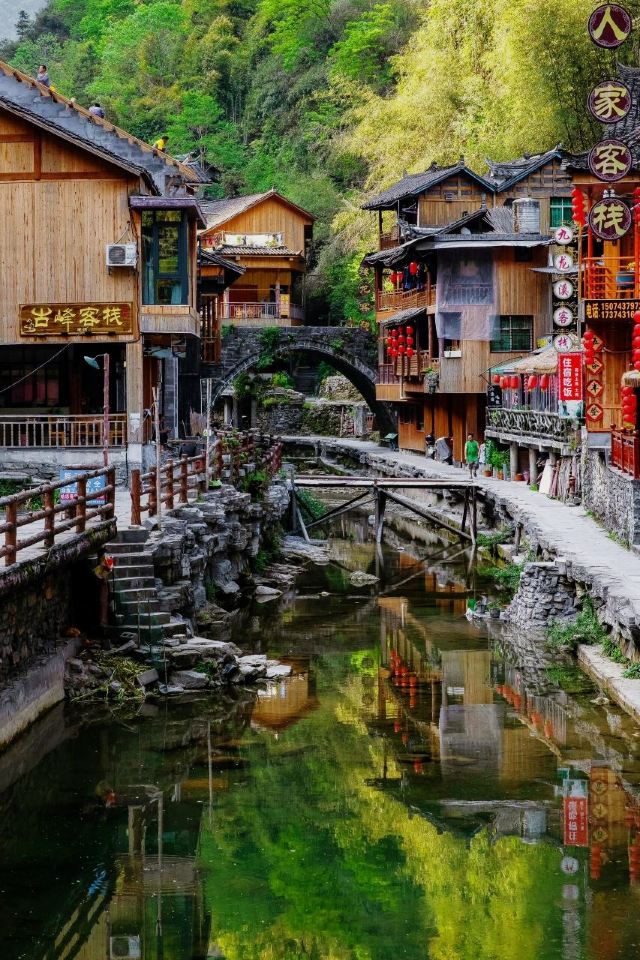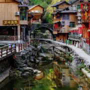 德夯苗寨位于吉首市,面积达到了580平方公里,这里自然风光秀丽迷人,由于山势跌宕、绝壁高耸、峰林重叠,形成了断崖、石壁、峰林、瀑布、原始森林等景观。区内溪河交错,四季如春,气候宜人,还有丰富的动植物资源。落差达216米的流纱瀑布,如白练凌空,似银纱悬壁;盘古峰海拔700多米,峰顶呈葫芦状,分大小两峰,绝壁千仞,天险难度,站立峰顶可将方圆景色尽收眼底。苗寨依山而建,被千山飞瀑环抱。民居具有独特的建筑风格,飞檐跷角、半遮半掩,封火墙、吊脚楼、雕花窗造型奇特,格调鲜明,色彩丰富,处处显示出远古遗民的氛围。