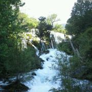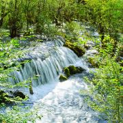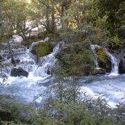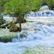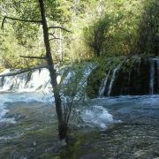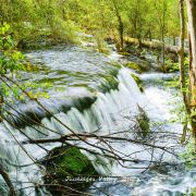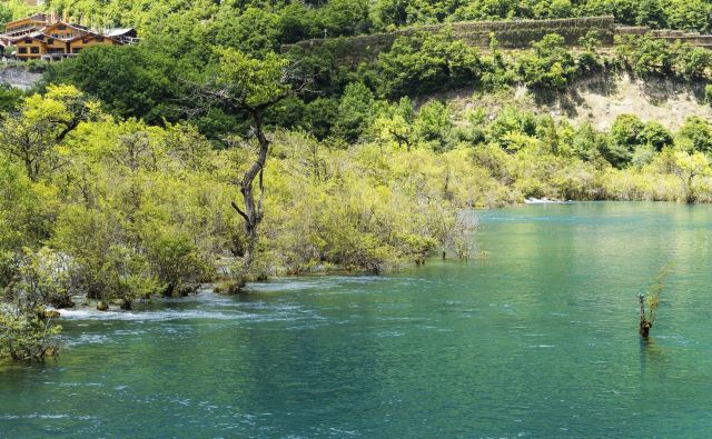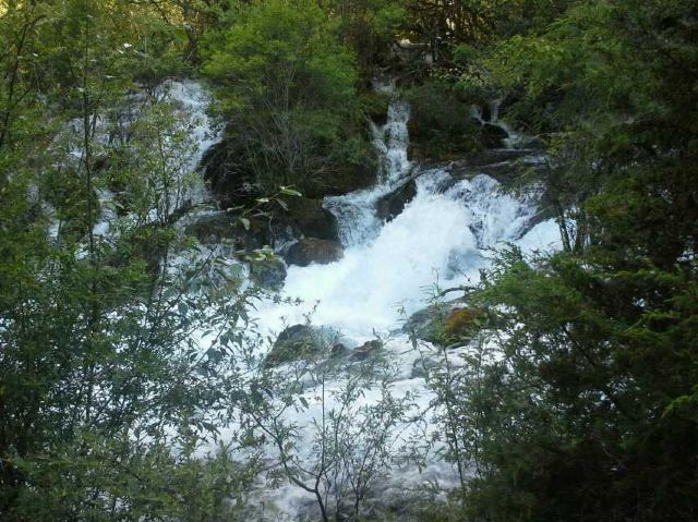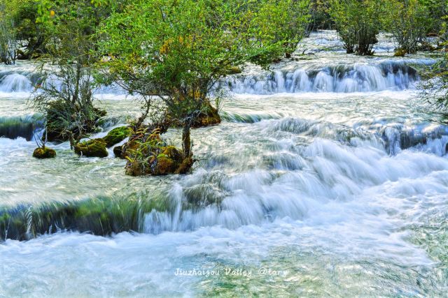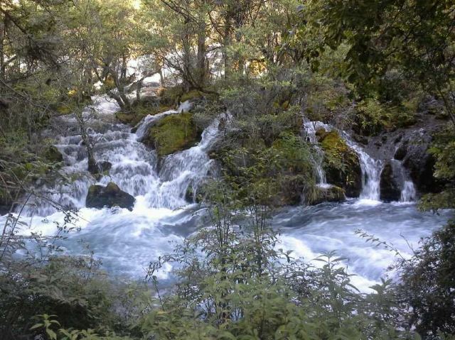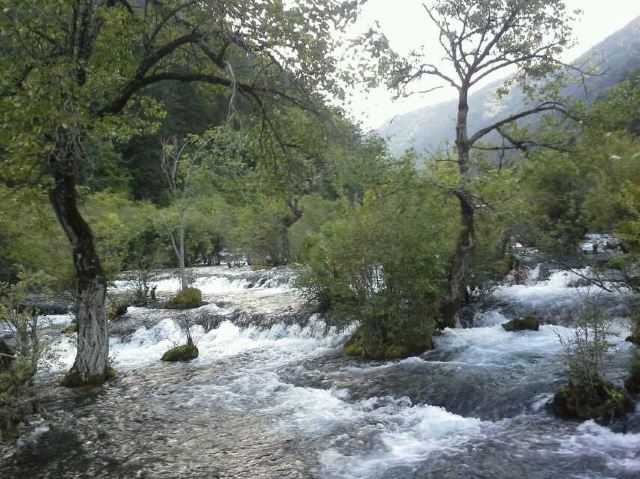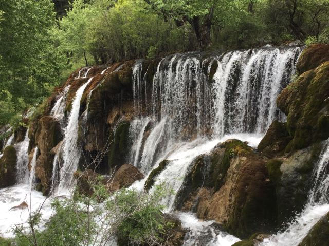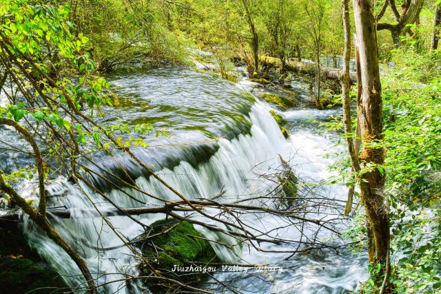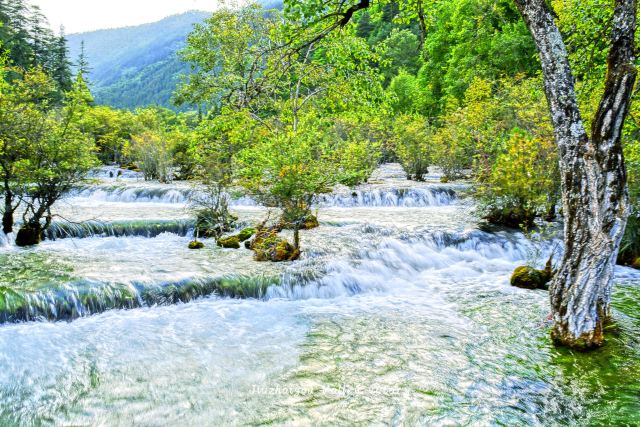 在这些大大小小的海子之间,长满了柳、杨、松、杉等树木和很多灌木丛,湖水自上而下翻堤而过,在树丛中穿行,形成一道道宽坦的瀑布,演绎着“树在水里长,水在林中流”的奇观。