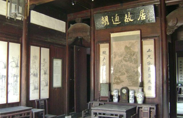 胡适故居在上庄村内。清光绪二十三年(1897)建。正屋南向,砖木结构,二进三间两厢,“回”形通转楼。占地208平方米,建筑面积350平方米。门面二柱单门一楼式,上嵌砖雕等。门前黑底金字“胡适故居”横额,下挂胡适中年画像。东西分列茶几、靠背椅,壁间挂胡适直系亲属图表。西部是胡适与江冬秀结婚房间,房内有木床、桌、椅、橱、凳等。前厢房是胡适童年读书处。东部房间连厢房为胡觉(胡适二兄)使用。正厅正厢房展出胡适家长手稿和部分著作、胡氏宗谱、海内外名士所赠字画、诗词和胡适“全家福”照片。后堂进深较浅,堂前挂胡适父亲画像,东侧有胡适生母照片。故居还陈列胡适各时期照片。