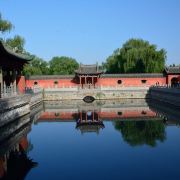 济渎庙坐北朝南,总体面积布局呈“甲”字形,总面积8万多平方米,主体建筑排列在三条纵轴线上,前为济渎庙,后为北海祠,东有御香院,西有天庆宫。这里朱门重重、庭院深深、古柏参天、碑碣林立绿、水环绕、曲径通幽、亭台楼榭、交相生辉,不仅是古代祭祀胜地,更是典型的北方古典园林。