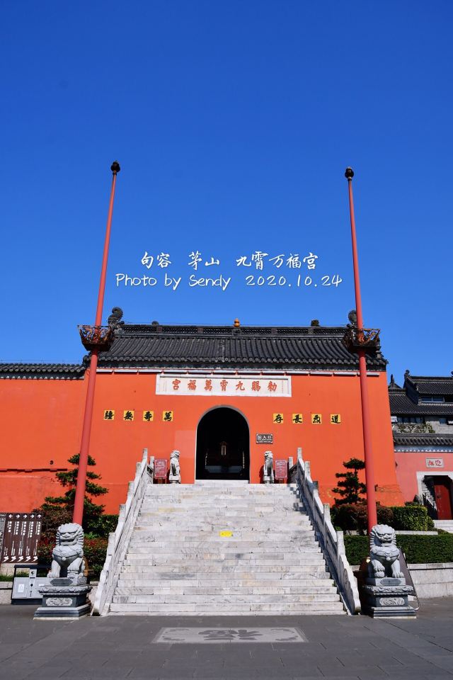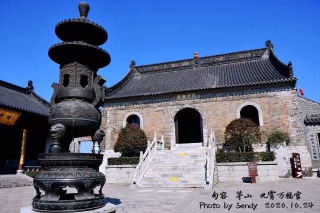 九霄万福宫位于句容市东南20公里处的茅山风景区内,因地处茅山最高峰大茅峰上,又名顶宫,一直以来都是游人朝山敬香必到处,有“顶上一柱香”之说,它与山下的元符万宁宫合称“茅山道院”。道观创建于西汉三茅真君茅盈、茅固、茅衷得道飞升后,明代万历二十六年(公元1598年),皇帝赐名“九霄万福宫”,可惜经近代战乱摧毁,现在看到的建筑多是现代重修的。茅山因地处句容市和金坛市的交界处,西边归句容管,东边归金坛管,九霄万福宫属于句容茅山。在句容茅山主入口(茅山西门)可坐观光车,站点涵盖景区各个主要景点,第一站去的就是九霄万福宫。徒步登山的话,大茅峰海拔372.5米,爬到山顶约需1-2小时。注意如果是从金坛金牛岭索道处(茅山东门)上来的,由于金坛方面管理的问题,徒步可能需在山脚支付登山费,坐索道的话就不用付了。步道与索道的终点都是山顶的九霄万福宫,但是入内参观要再次购买句容茅山的门票。金坛山脚是没有句容茅山门票出售的,必须到山顶后购买。从金坛爬到大茅峰顶,也需1-2小时。九霄万福宫外围红色的宫墙非常显眼,主体建筑南北走向,沿中轴线由南到北可依次参观灵官殿、藏经楼、太元宝殿、二圣殿。主殿太元宝殿由青砖砌成,供奉三茅真君,大殿拱门上的精美石雕和殿内两侧墙壁上道教神仙名位刻石,看上去有点年头了,可能不是近年重修之物。太元宝殿东西两侧分别是太岁殿和财神殿。二圣殿供奉三茅真君的父母。殿前飞升台上有三天门石坊,这里是茅山极顶海拔372.5米的地方,据说也是三茅真君里的大哥茅盈飞升的地方。整个九霄万福宫因地处山顶,站在道观边缘观景台,可俯看山下景致,还能眺望到元符万宁宫。二圣殿东西两侧分别是白鹤厅和怡云楼,怡云楼内珍藏着宋代皇帝送给元符万宁宫的珍宝玉印、玉圭、玉符、哈砚,不过这“镇山四宝”一般是不展出的。道观西侧的坎离宫门牌上写着“茅山顶宫预测室”,可以看面相手相,购买宗教书籍。即使不来这里,道观里也会有道士主动为你解读命运,费用昂贵,但可以礼貌地回绝。九霄万福宫烧香祈福灵验,茅山景区外的很多小贩和景区内各道观都有卖香火,景区外买的、自备的香火都是可以带进道观的。元符万宁宫因宋代皇帝送的“九老仙都君印”又名印宫,但是现在盖这样一枚印章的地方,其实是在九霄万福宫,普通游客比较难请到,要旅游团电话联系了景区后,和九霄万福宫说好,来时才能请到。