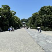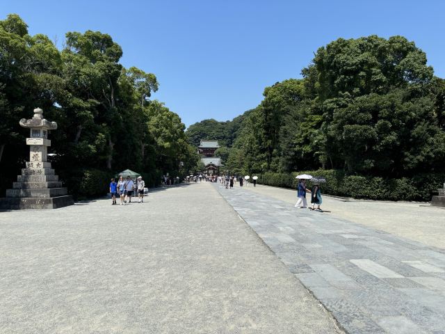 5分 超棒正对着“鹤冈八幡宫”的红色大鸟居,有一条高出地面一米多的人行步道,底座两侧用黑色的石头垒砌而成,中间填满了细结的黄土,已被走踏了千年,压得比水泥地还平整坚硬。