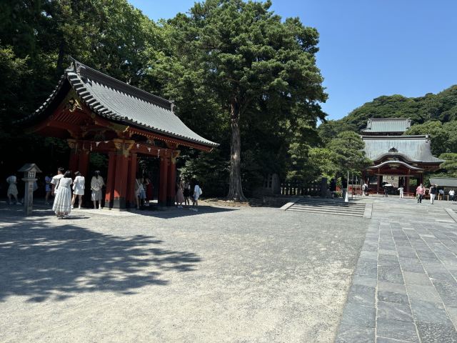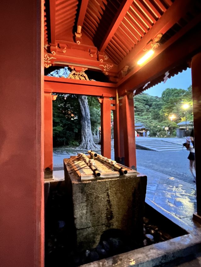 从车站走过来也挺久的,一路上没什么人,很怕自己走错路。如果行程很多,赶时间的话可以跳过这个景点。但穿过鸟居后的神圣感很特别,参道两侧古树参天,让人自然静下心来。入口处有手水舍(洗手漱口的地方),可以体验一下。晚上点灯后气氛更庄严,人少拍照也好看。虽然不算最华丽的神社,但作为镰仓的历史中心,还是值得来感受一下气氛~